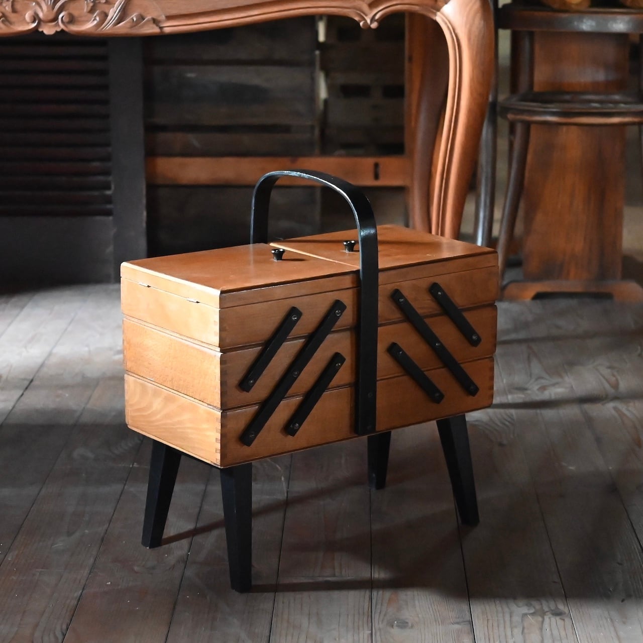 脚付きのツートンカラーが素敵なソーイングボックスで、蓋を引っ張ると左右3段ずつ収納BOXが付いています。