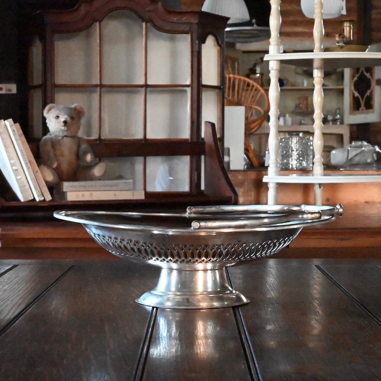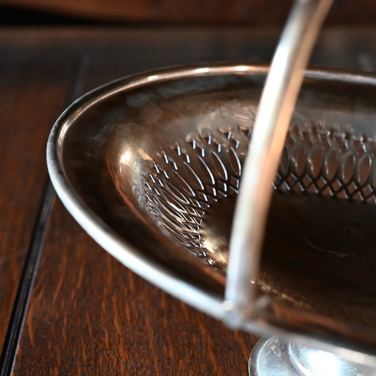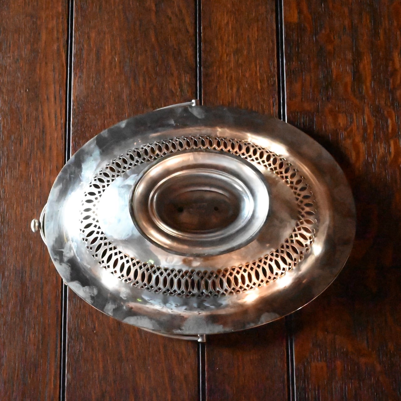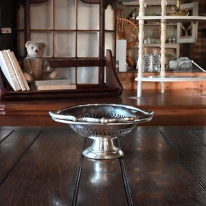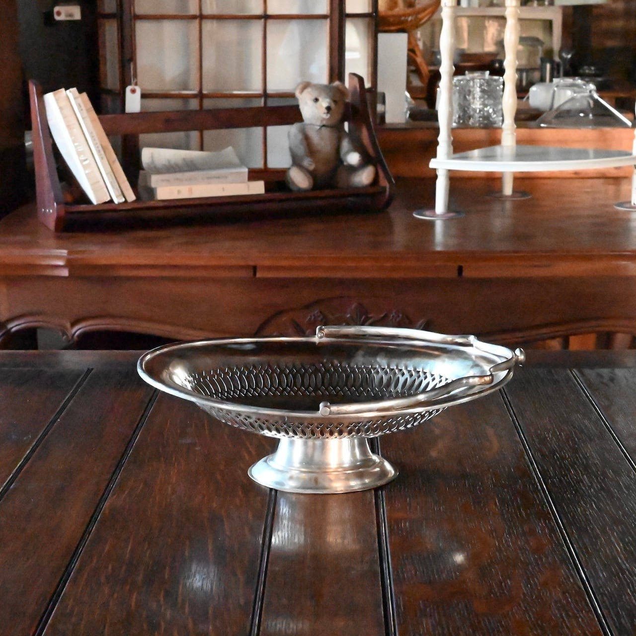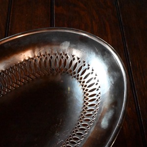 脚付きでオーバル型の深さのあるプレートに透かし彫りが施されたエレガントな雰囲気のバスケットです。