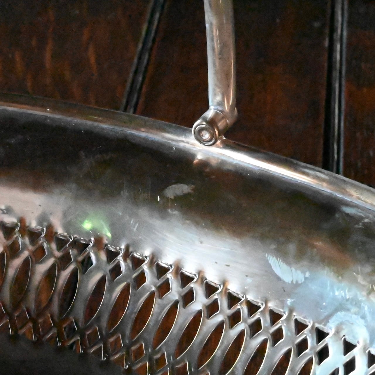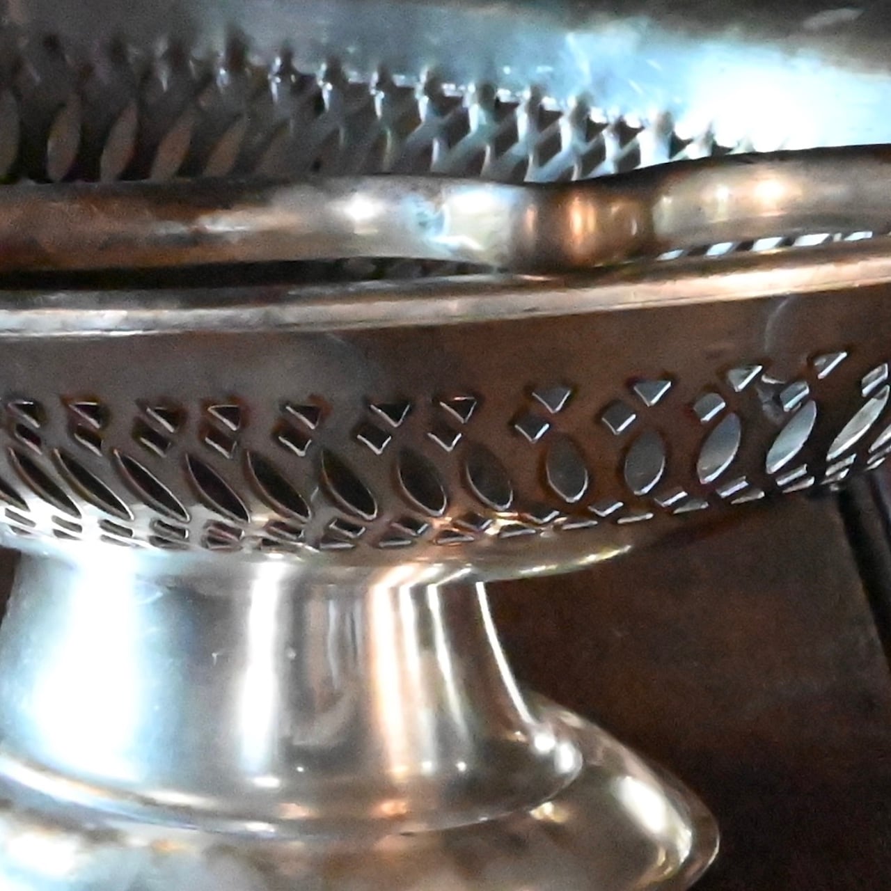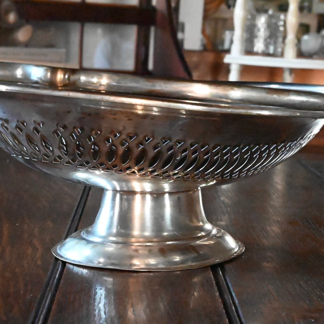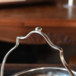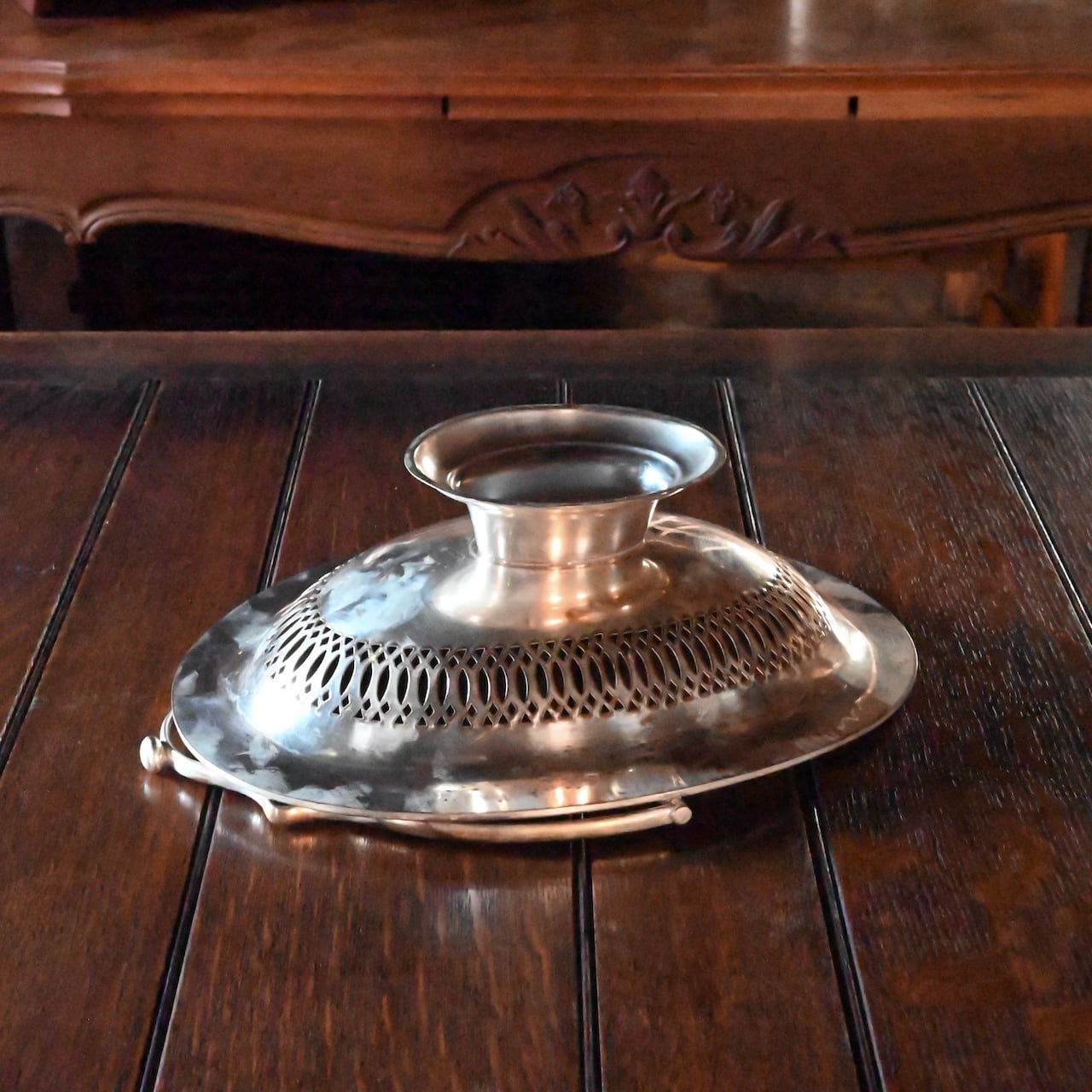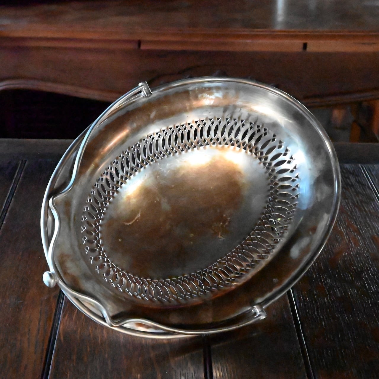脚付きでオーバル型の深さのあるプレートに透かし彫りが施されたエレガントな雰囲気のバスケットです。