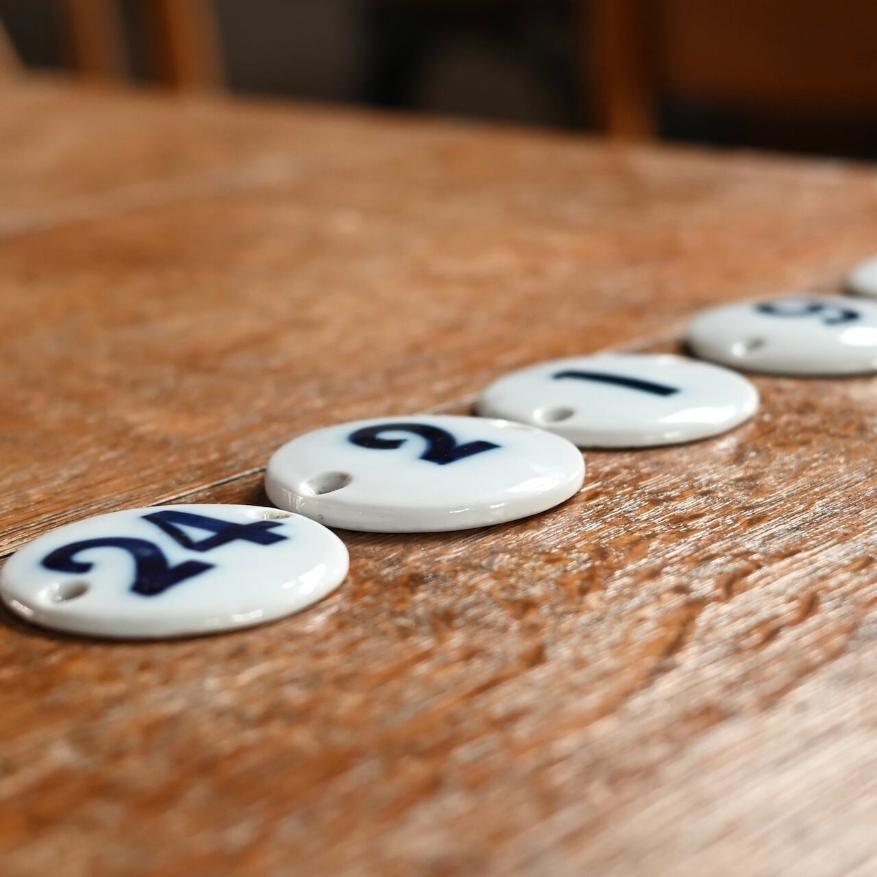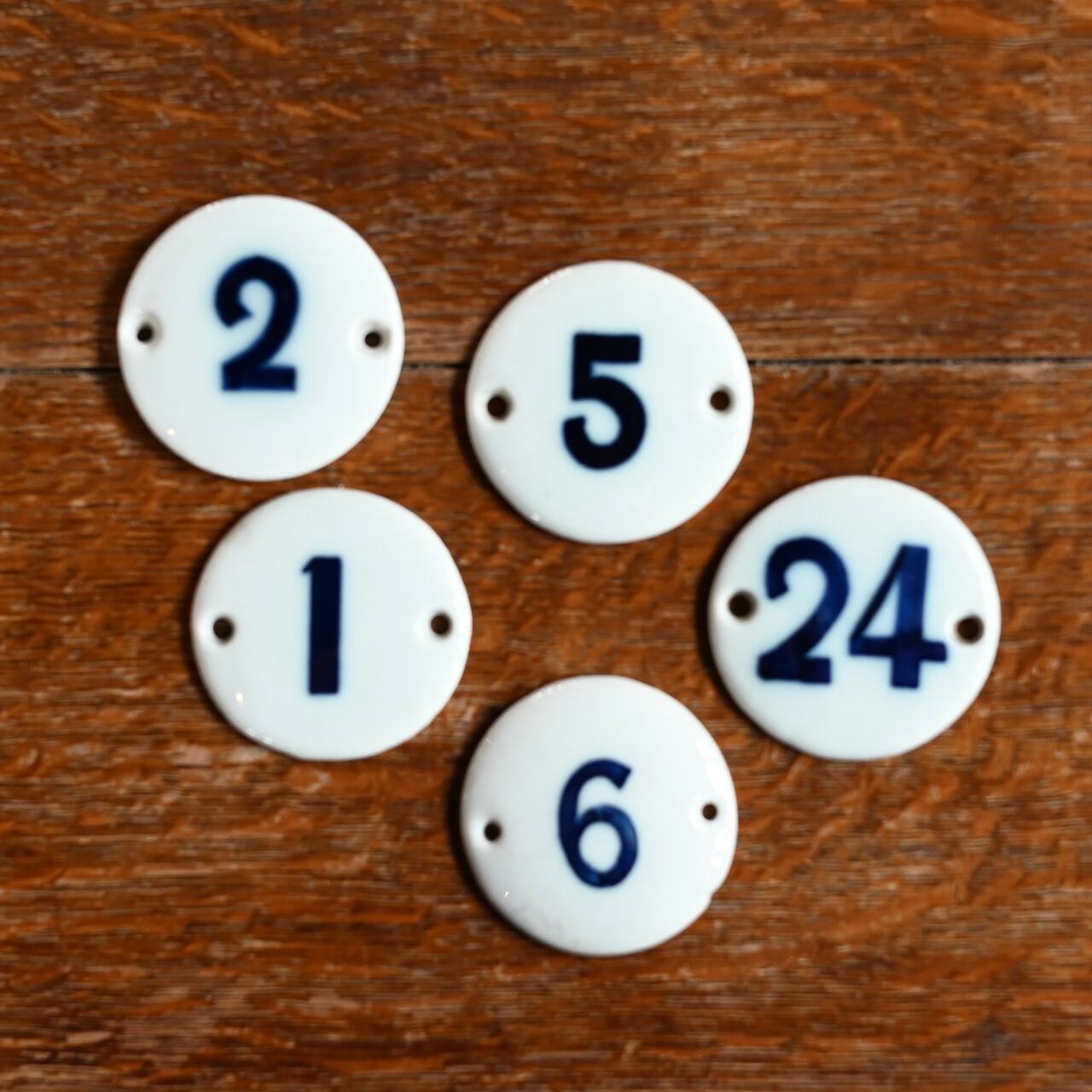 陶器の艶のある白地にブルーのナンバーが可愛いプレートです。