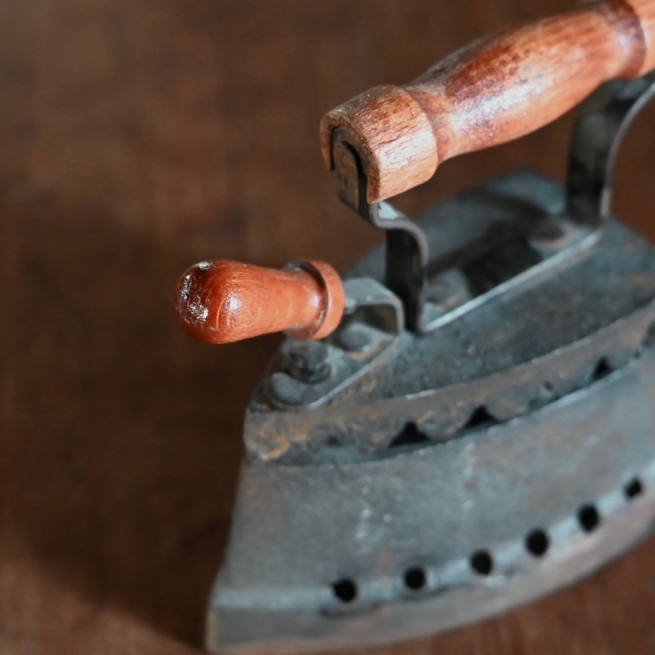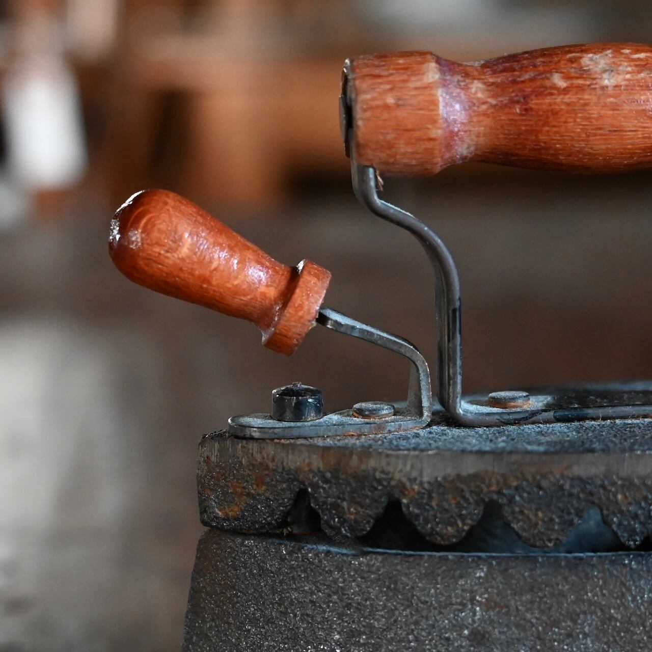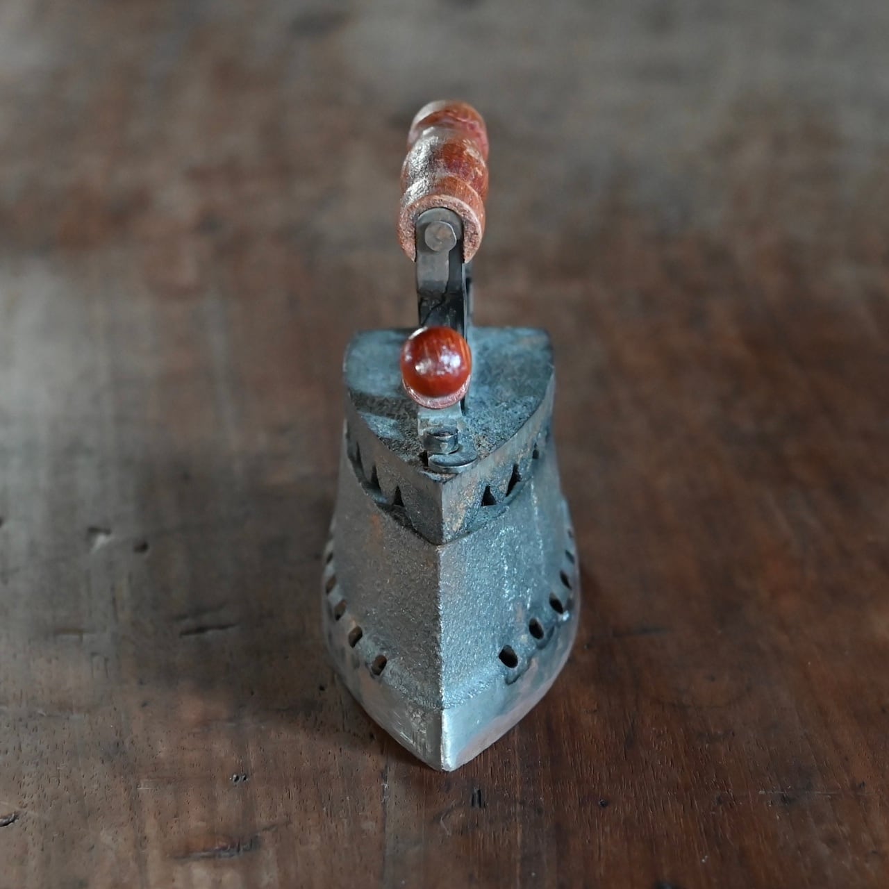 木製の持ち手を捻ると上の蓋が開くようになっていて、元はその中に熱した石炭などを入れてアイロンとして使用されていました。