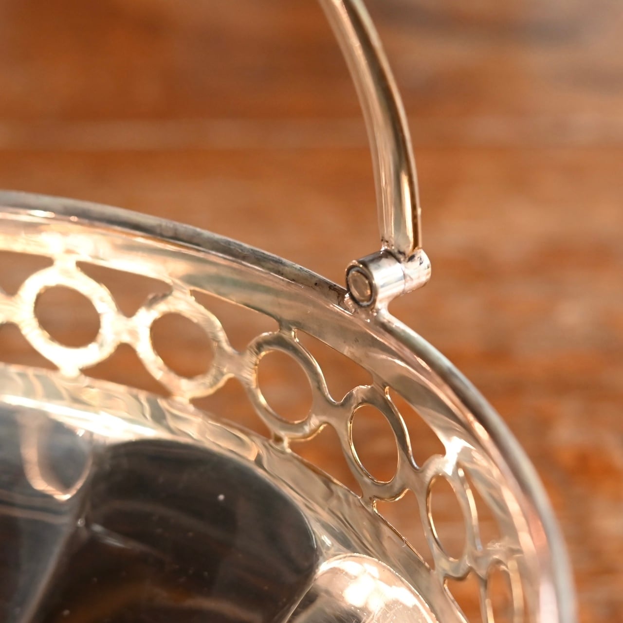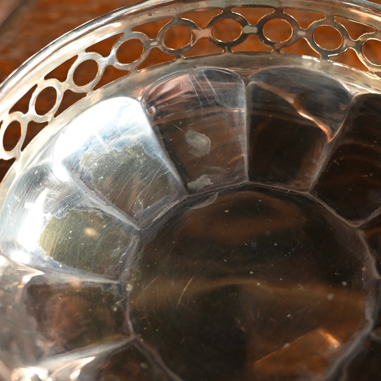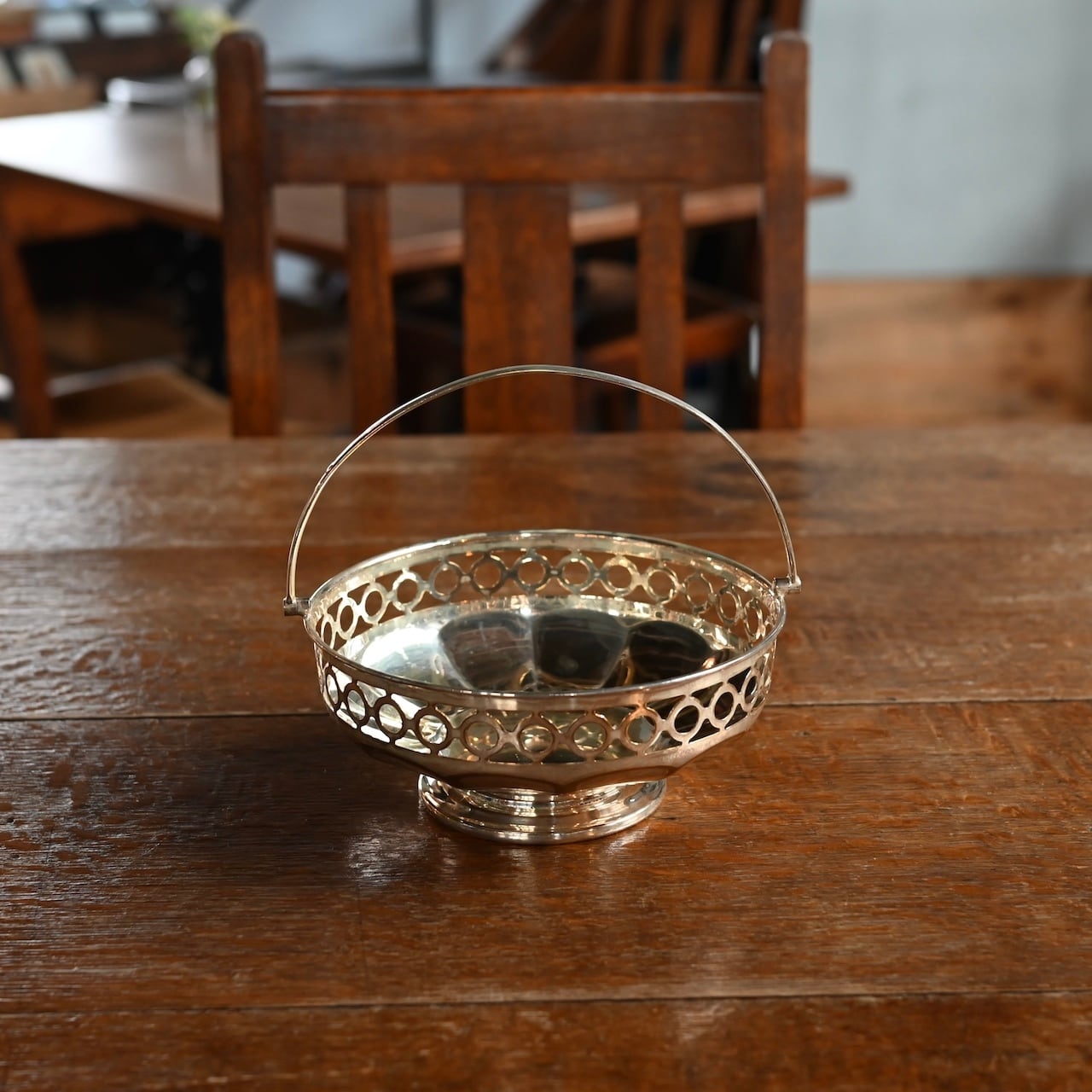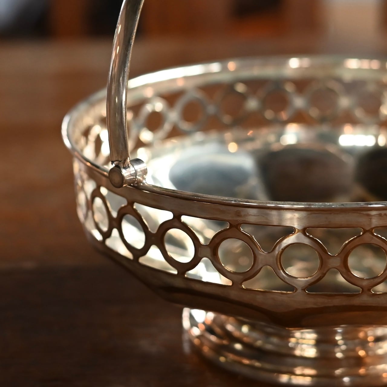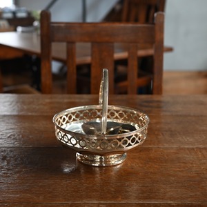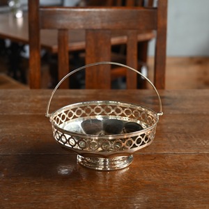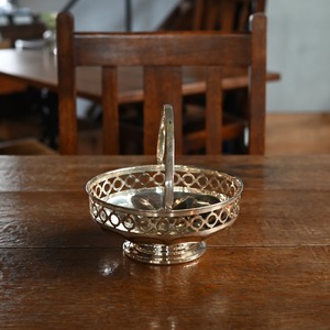 脚付きで深さのあるプレートに透かし彫りが施されていて、プレート部分はお花のようなデザインの可愛らしいバスケットです。