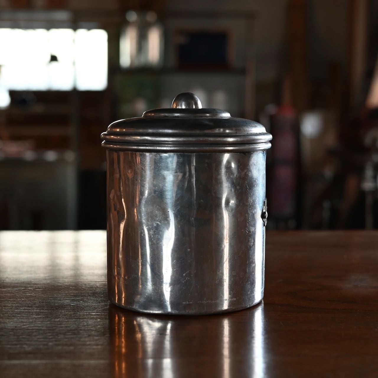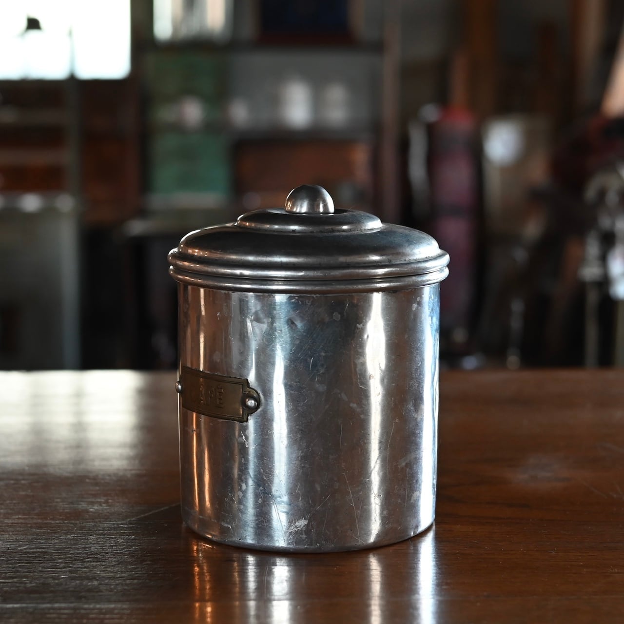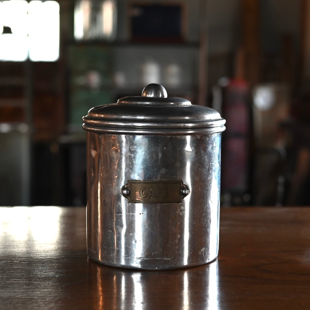 「CAFE」のプレートが付いていて、蓋のデザインが可愛らしいアルミのキャニスターです。