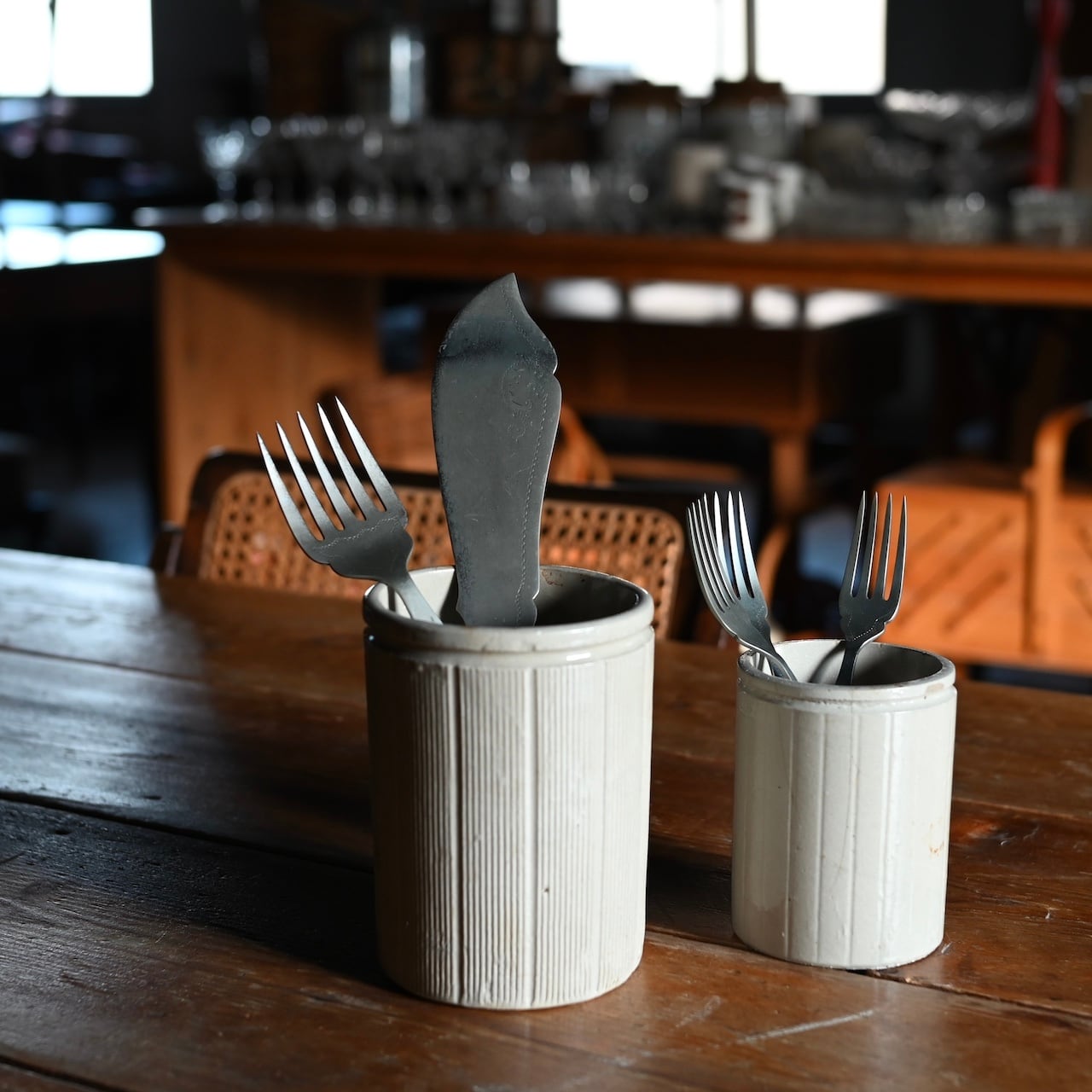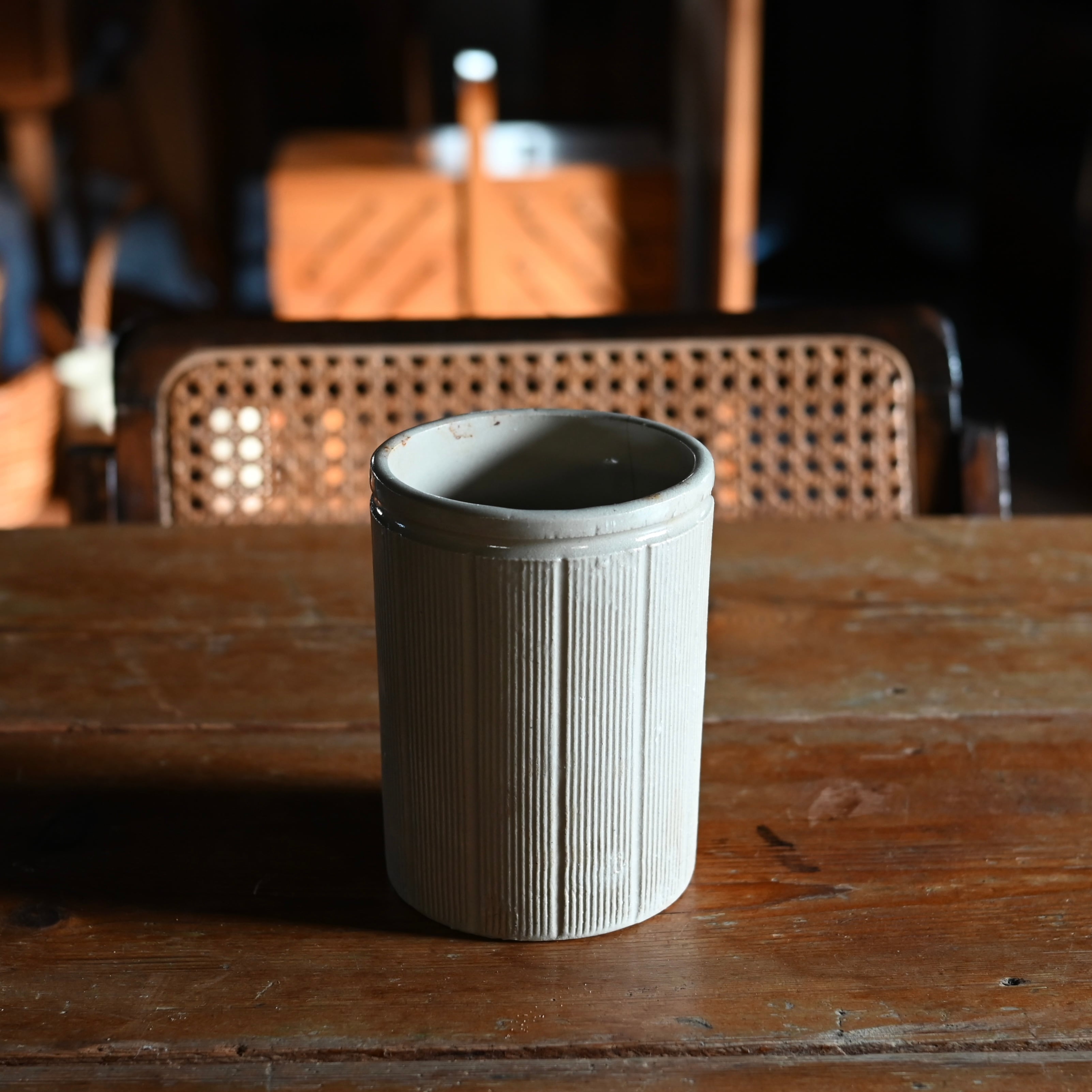 全体的に傷や欠け、貫入が多く、アンティークの風合いが魅力的で、カトラリーの収納やペン盾として使用するのがおすすめです。