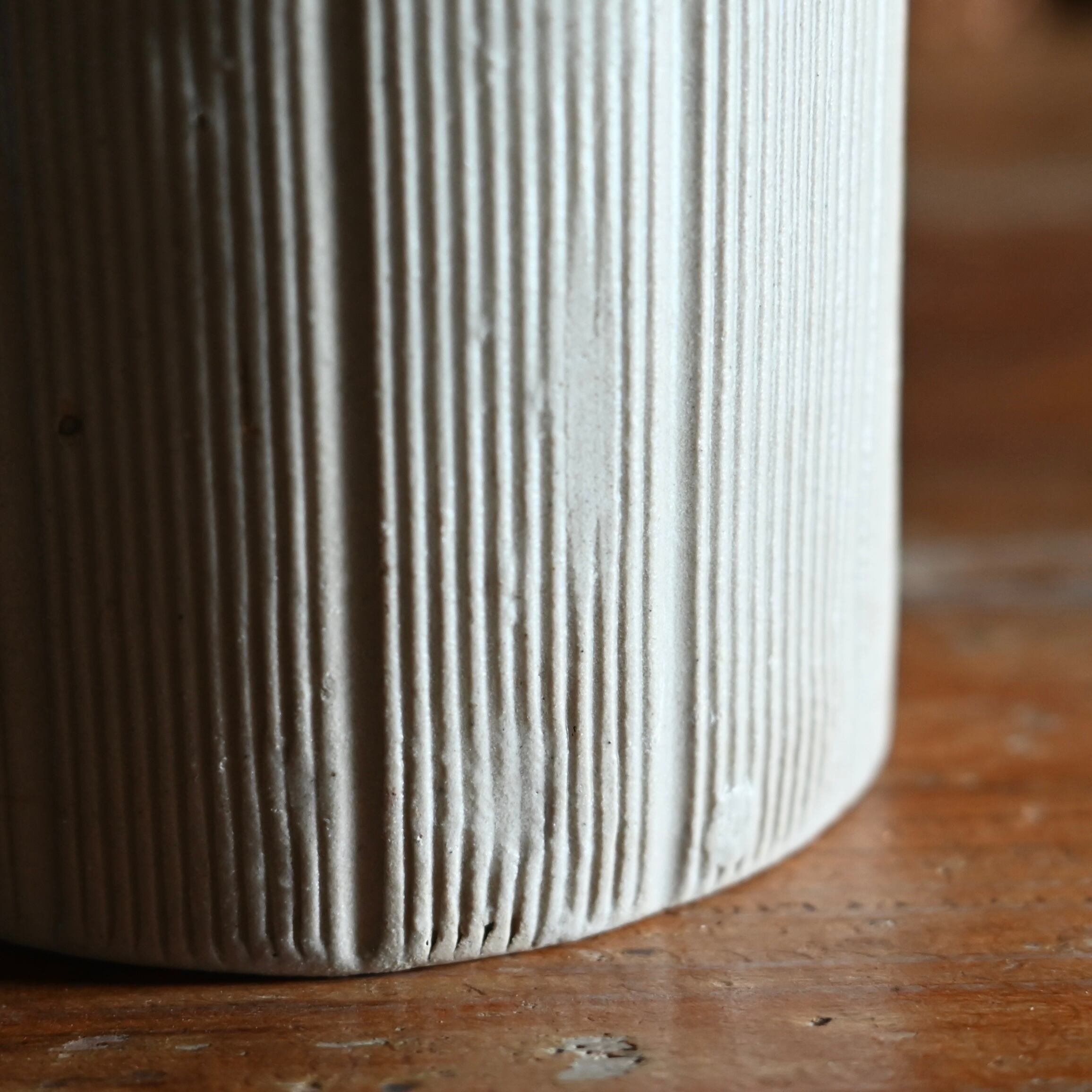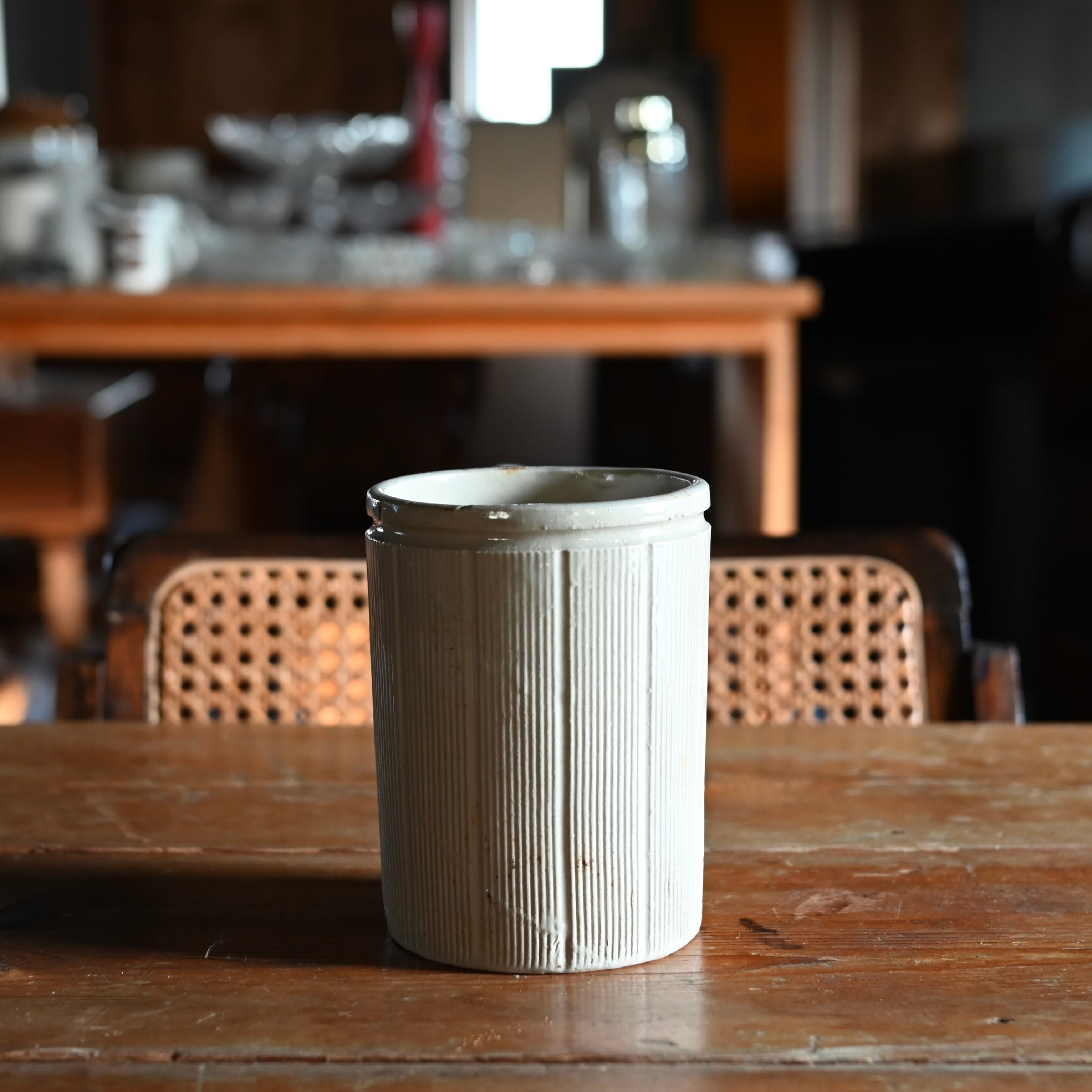 元々はジャムが入っていた容器で、クリーム色と縦のラインが可愛らしいデザインです。