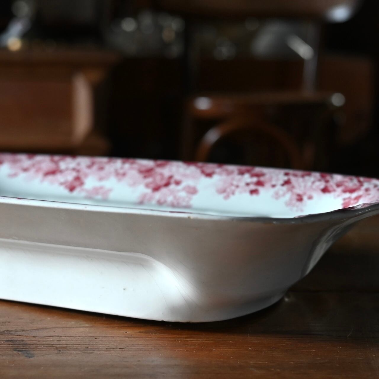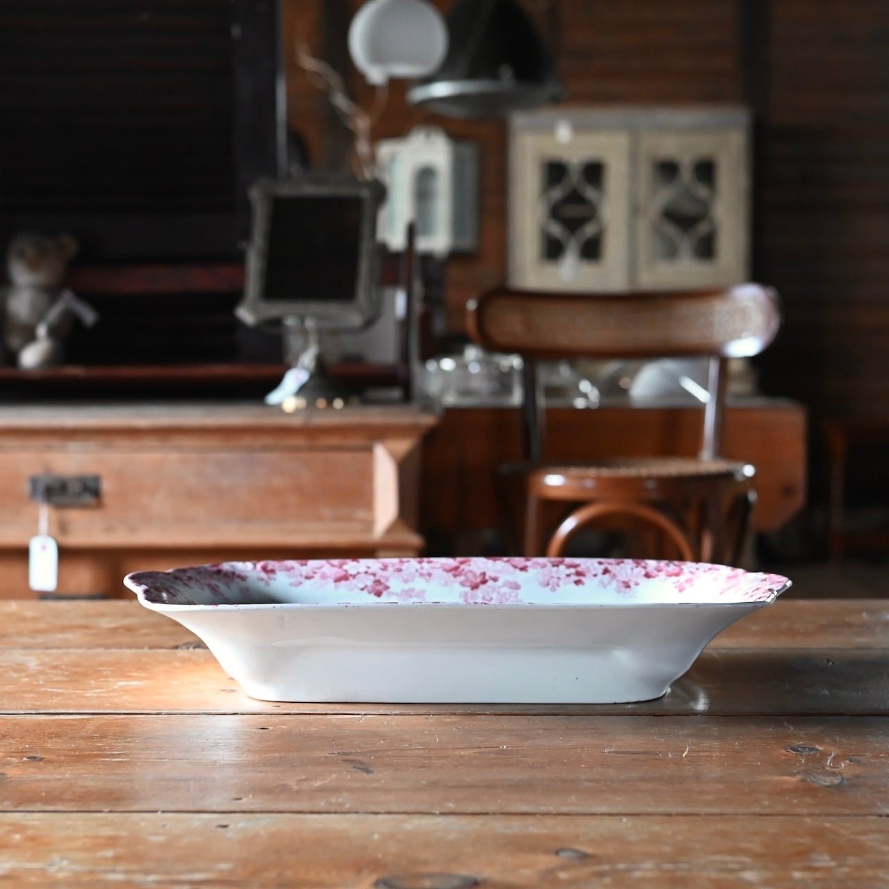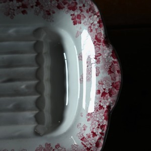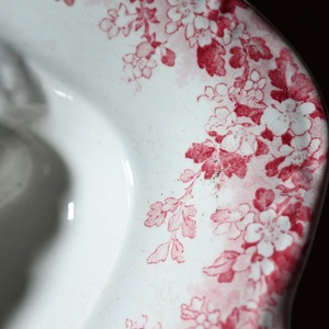 赤色で描かれた植物柄が美しく、全体的にくすみや貫入、欠けなどもありますが、お店の什器などとして置いておくだけでも存在感のある1枚です。