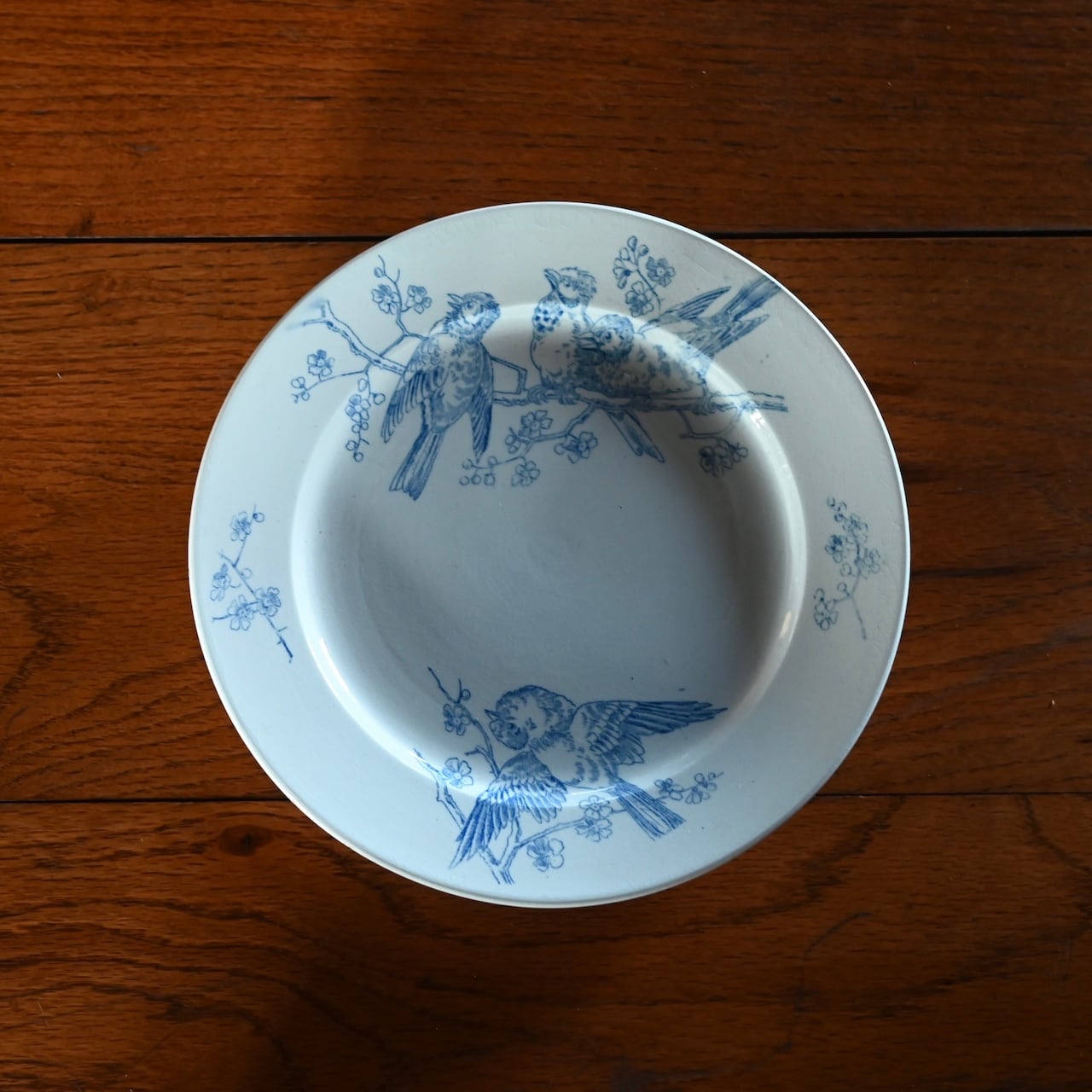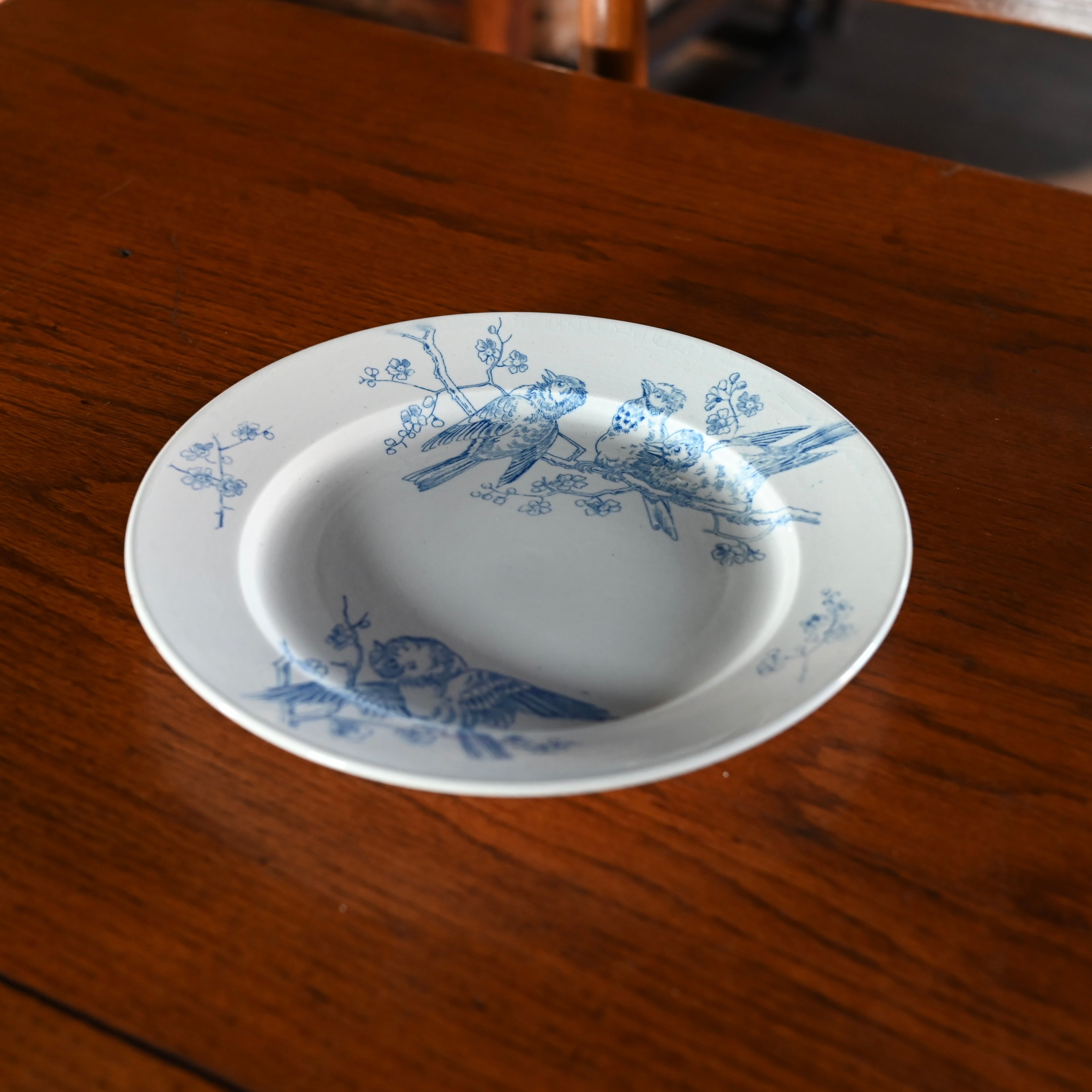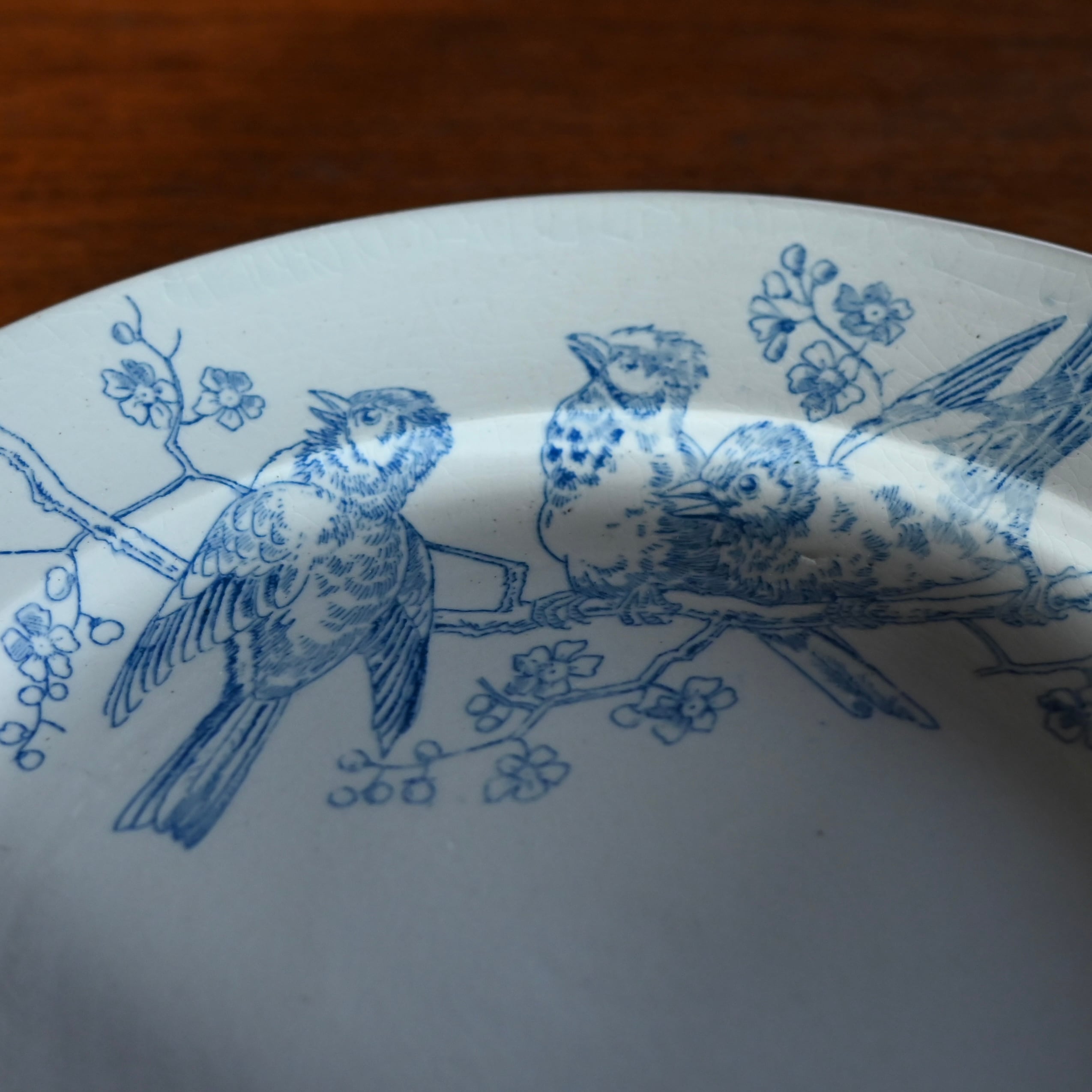 直径が約238mmのプレートで、落ち着いたブルーのラインで鳥と花が描かれています。