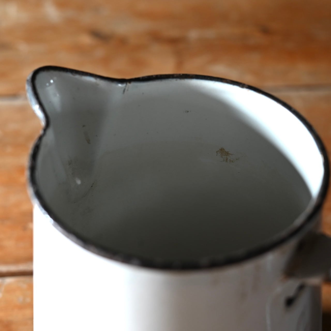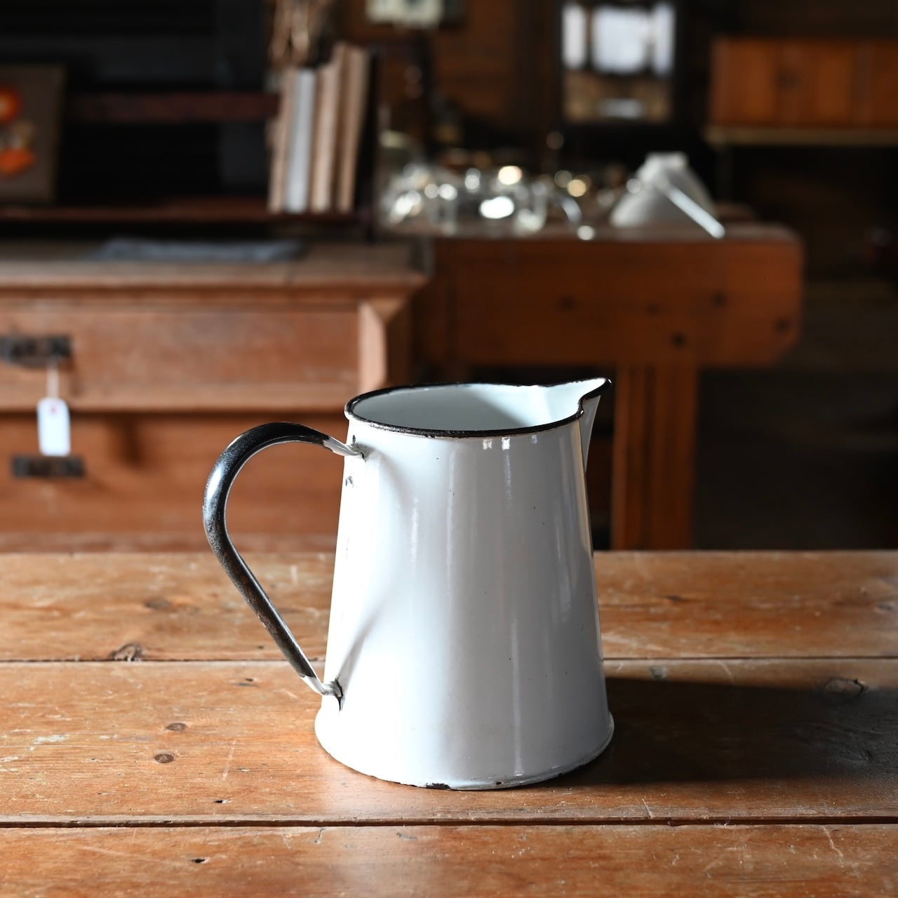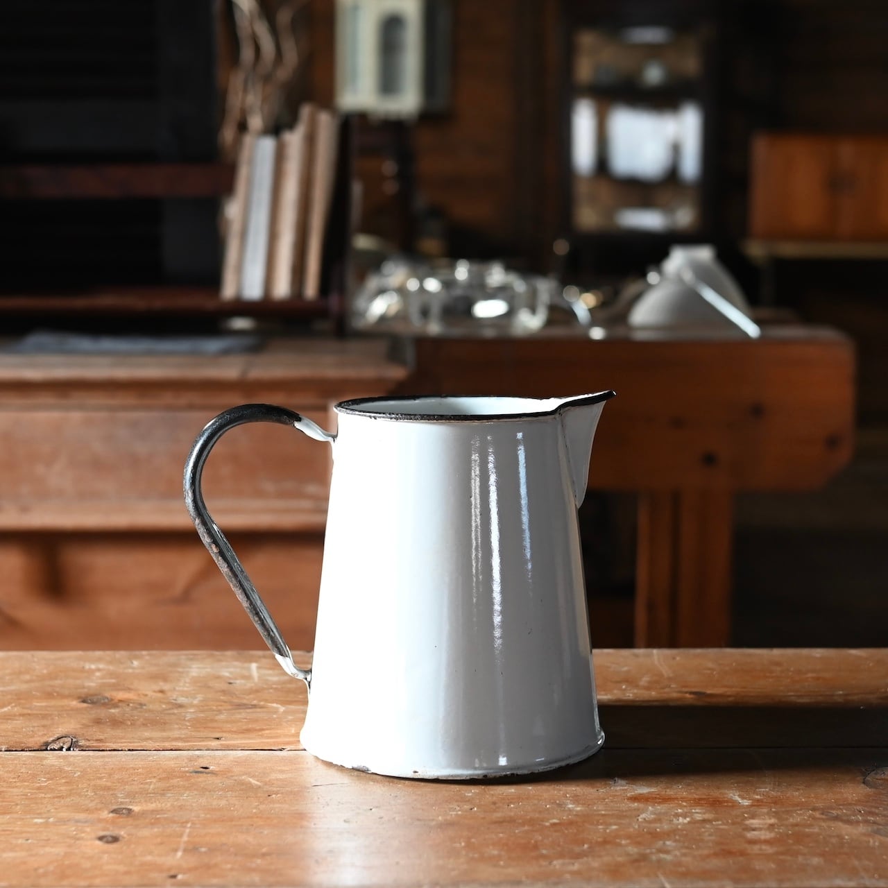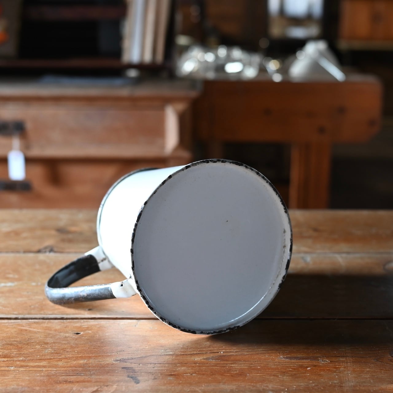 白地の琺瑯に大きな持ち手が付いた琺瑯のジャグです。