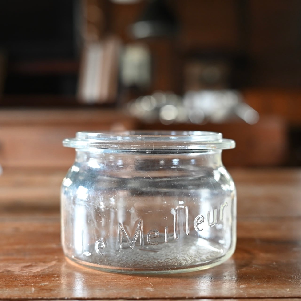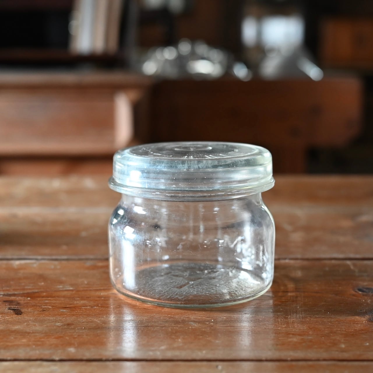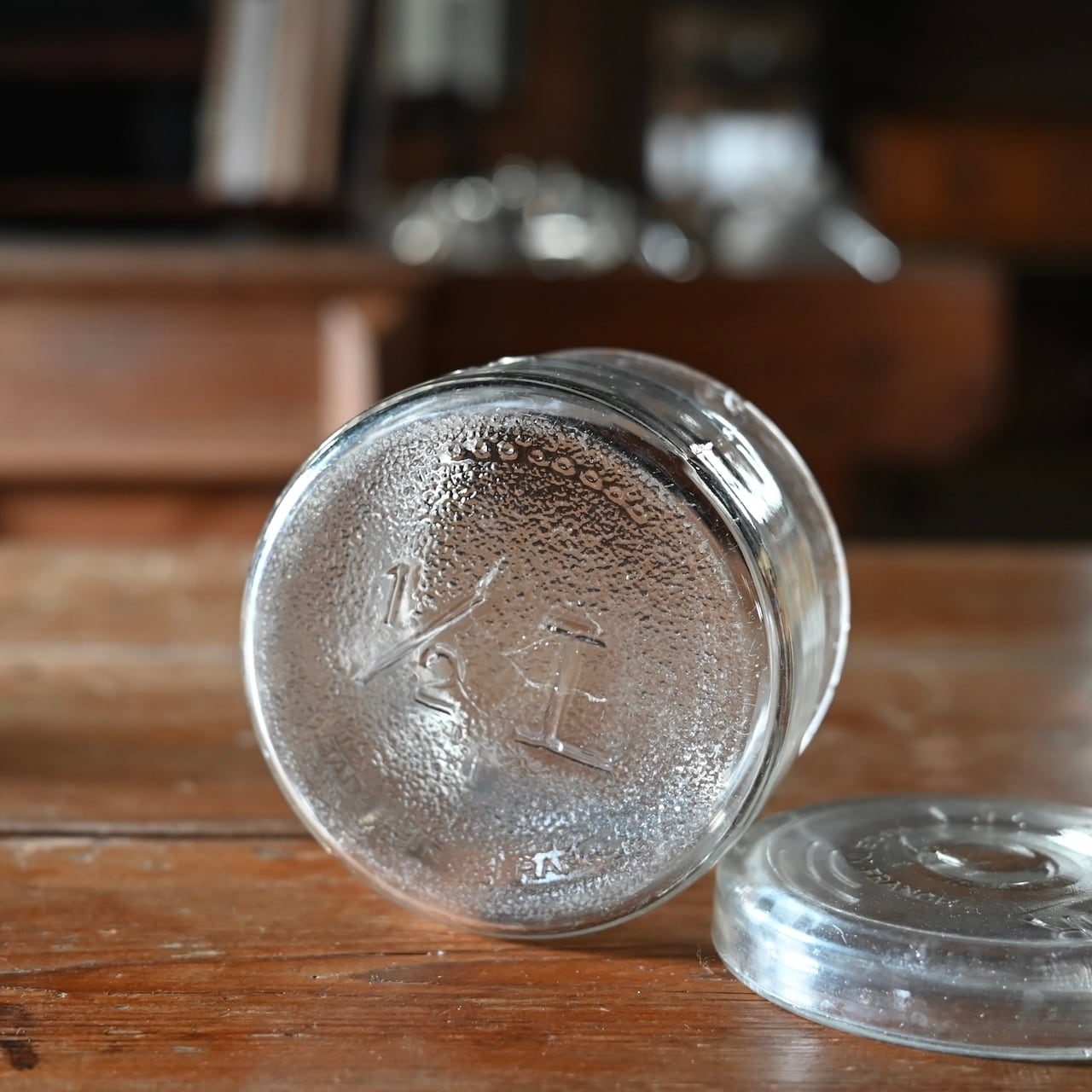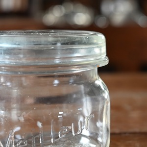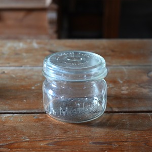 ぽってりとした蓋付きの可愛らしいガラスのキャニスターで、本体と蓋にロゴが入っています。