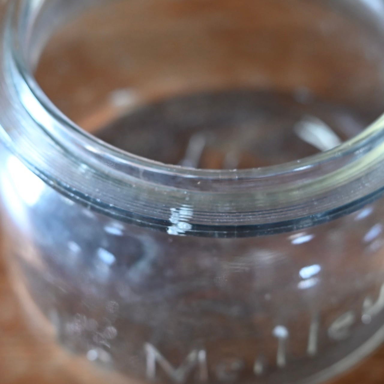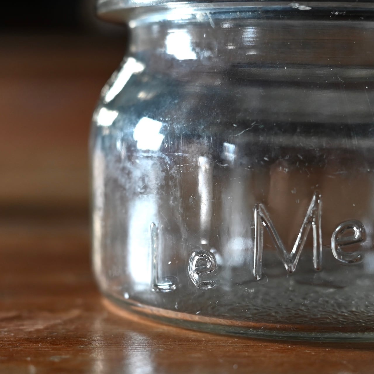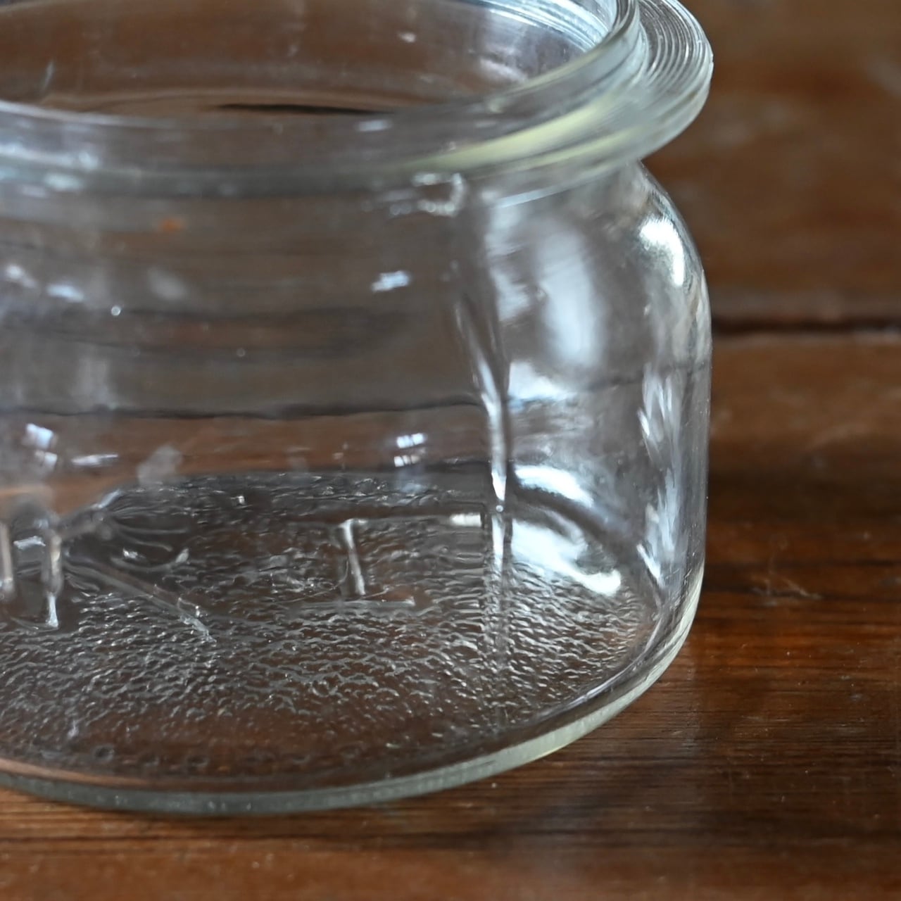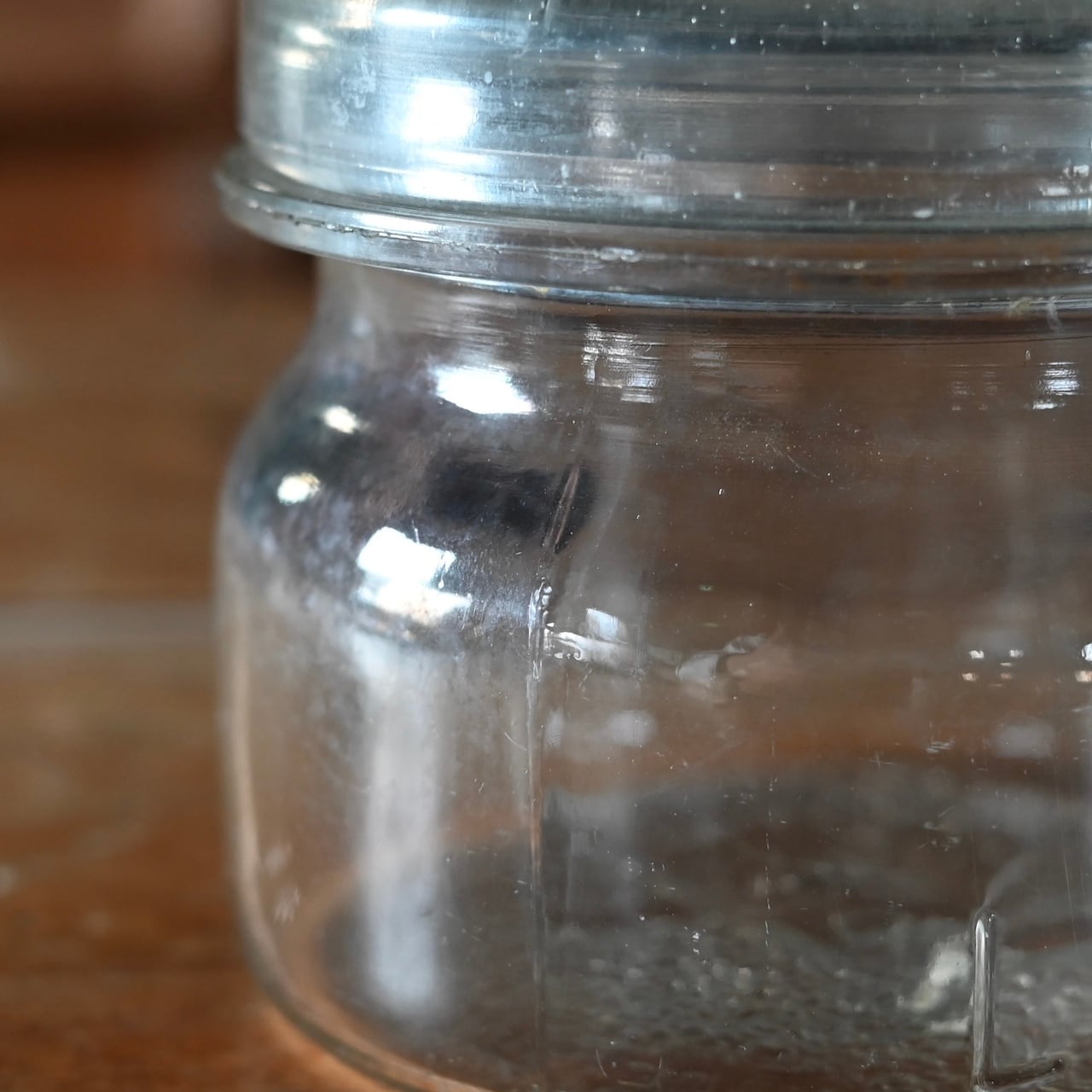 ぽってりとした蓋付きの可愛らしいガラスのキャニスターで、本体と蓋にロゴが入っています。