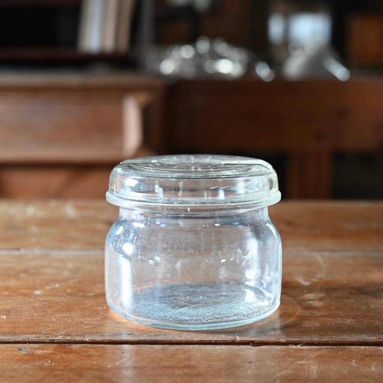 ぽってりとした蓋付きの可愛らしいガラスのキャニスターで、本体と蓋にロゴが入っています。