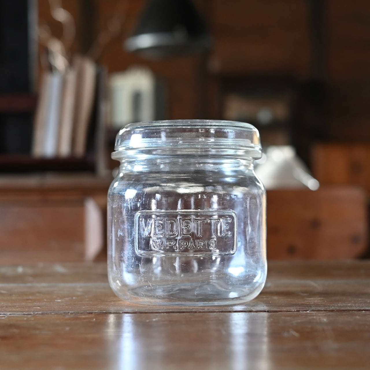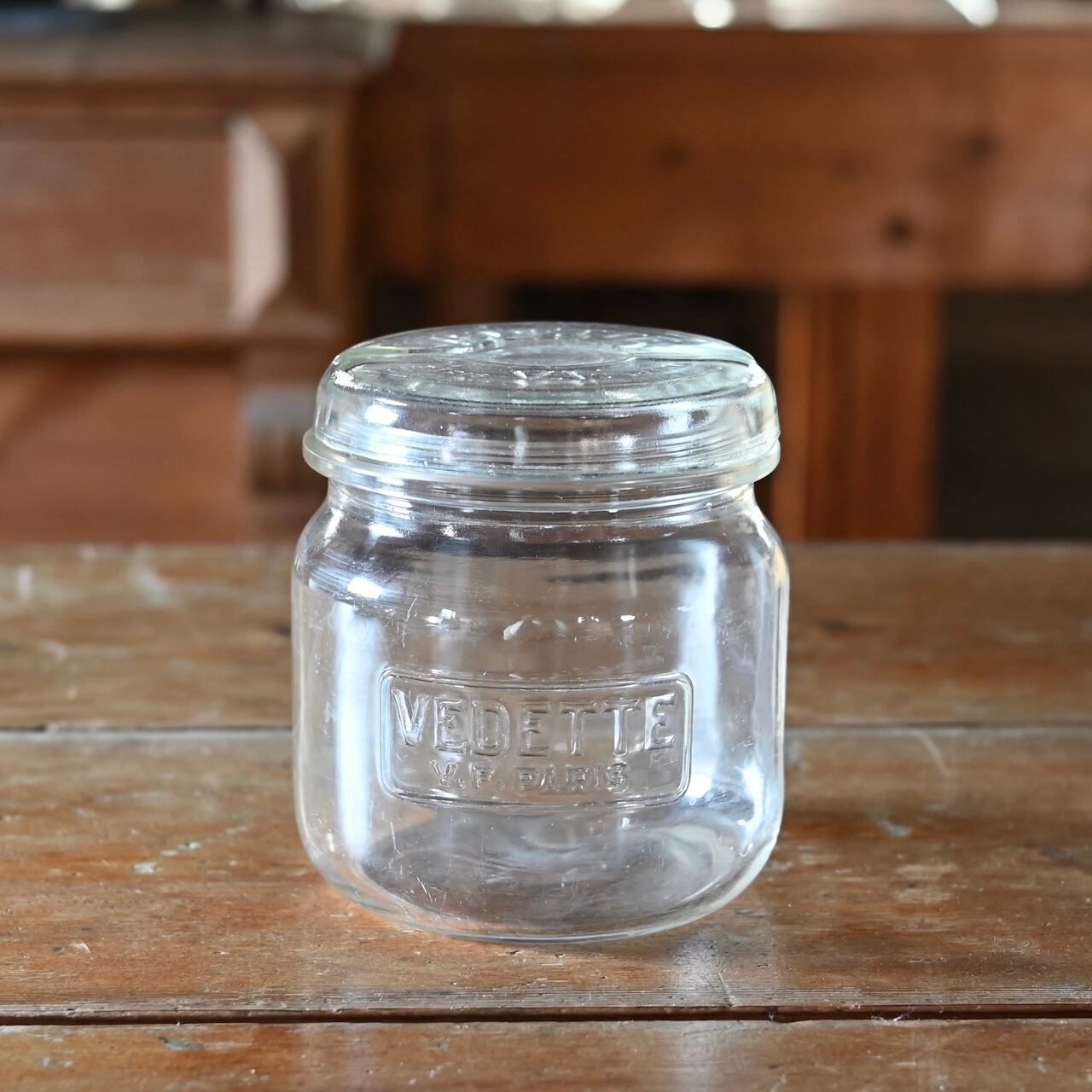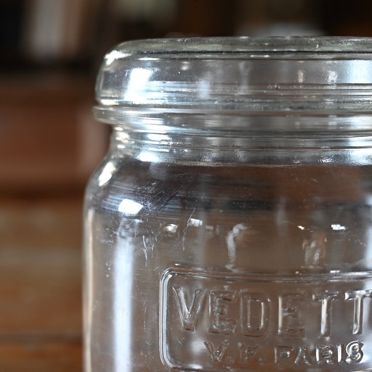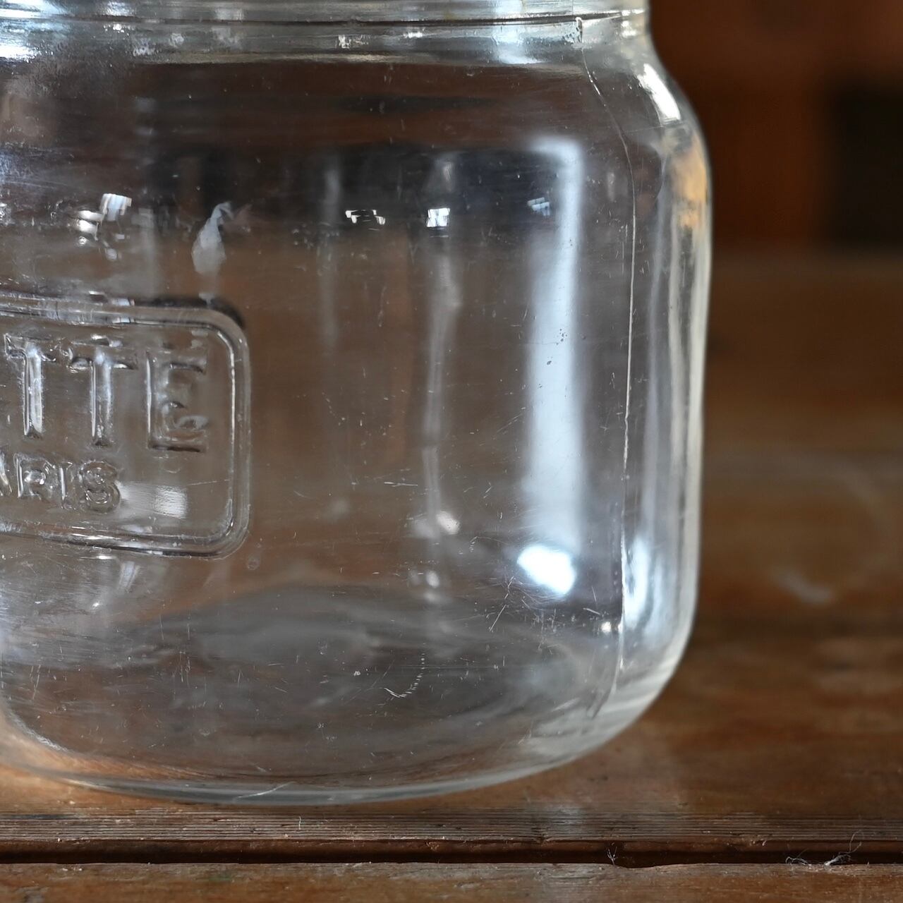 ぽってりとした蓋付きの可愛らしいガラスのキャニスターで、本体と蓋にロゴが入っています。