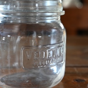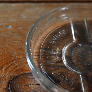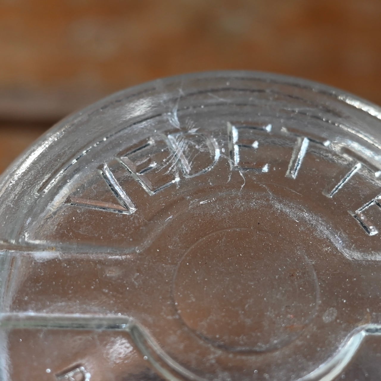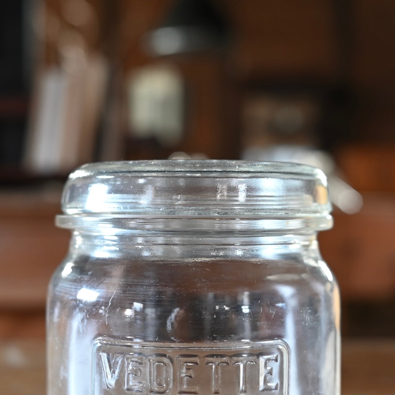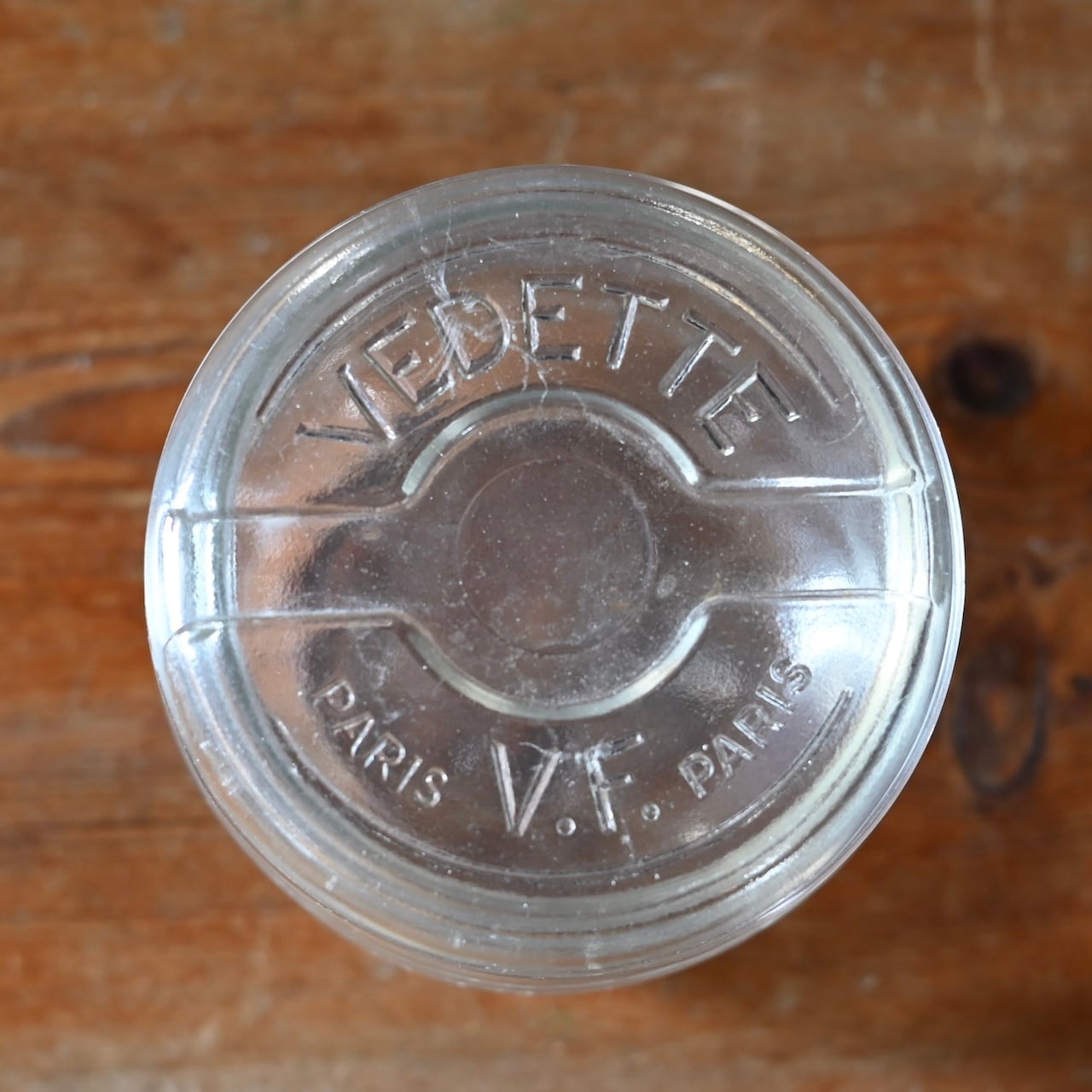 ぽってりとした蓋付きの可愛らしいガラスのキャニスターで、本体と蓋にロゴが入っています。