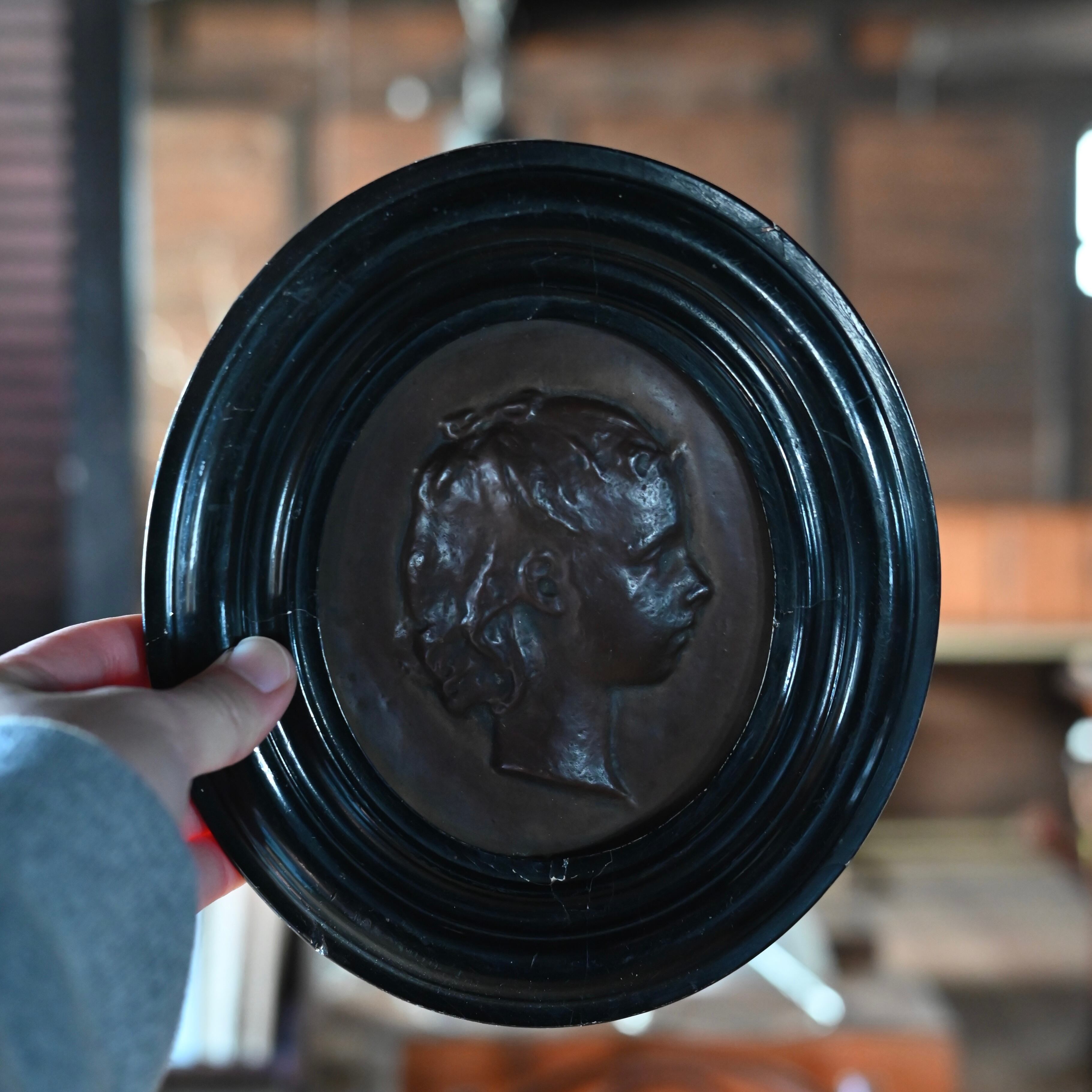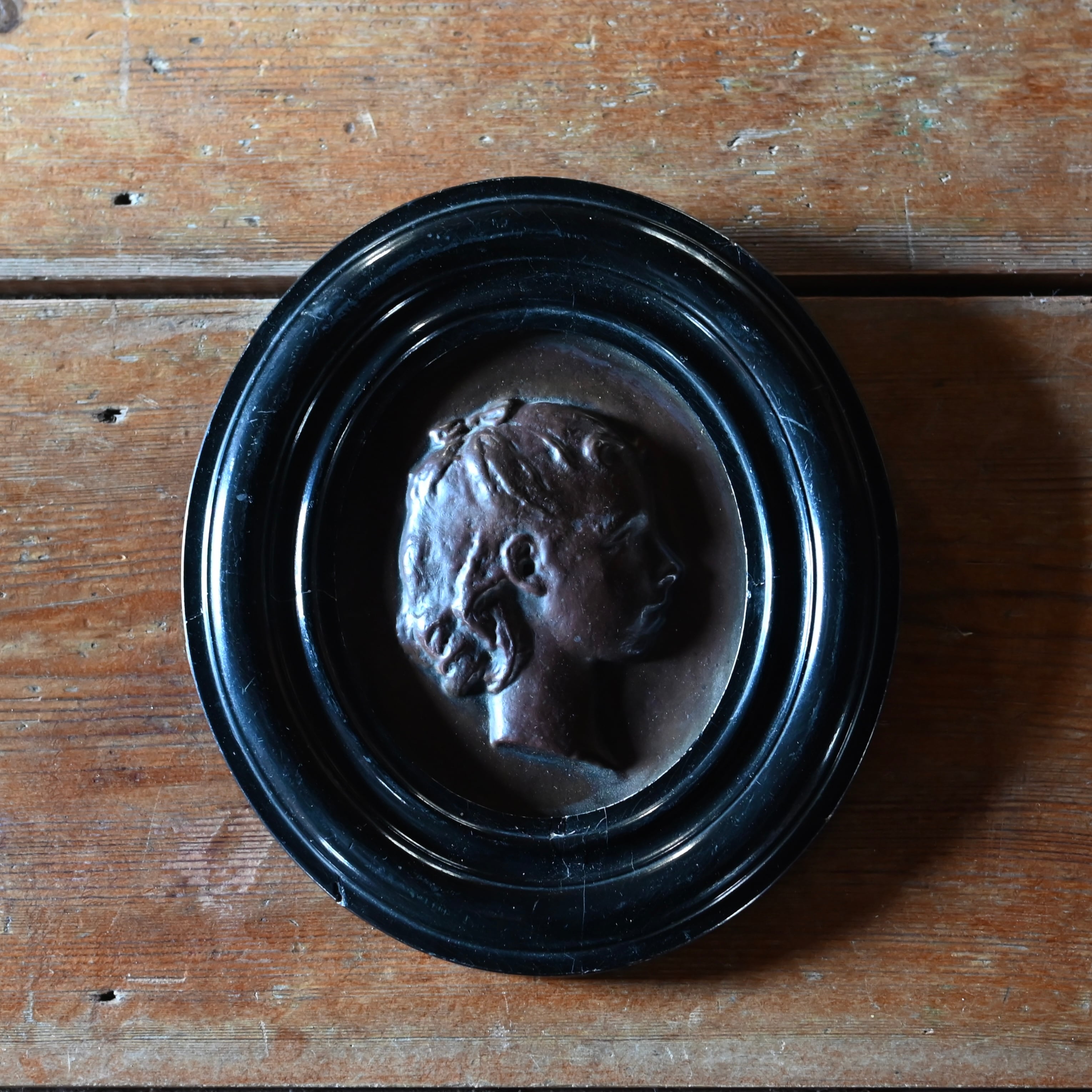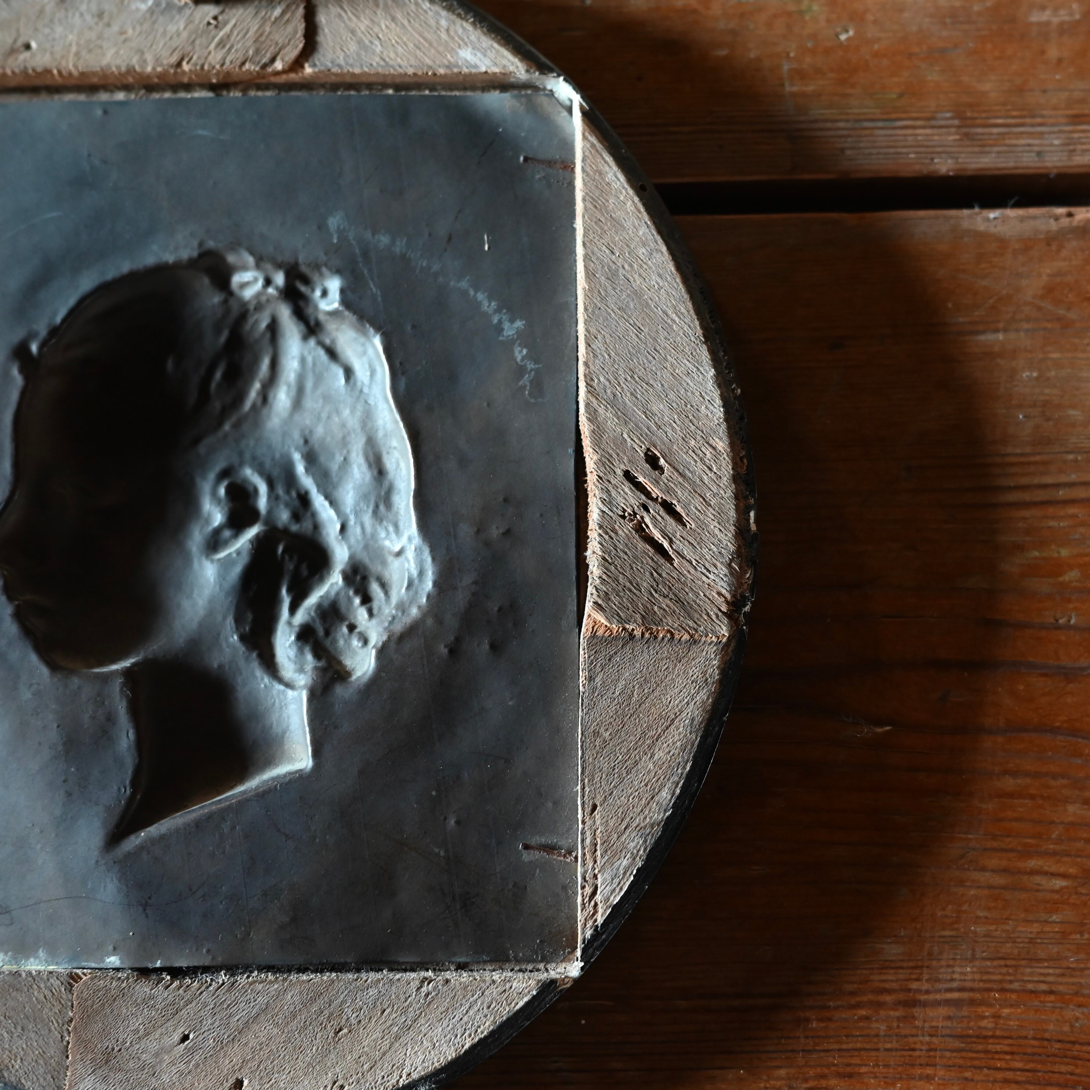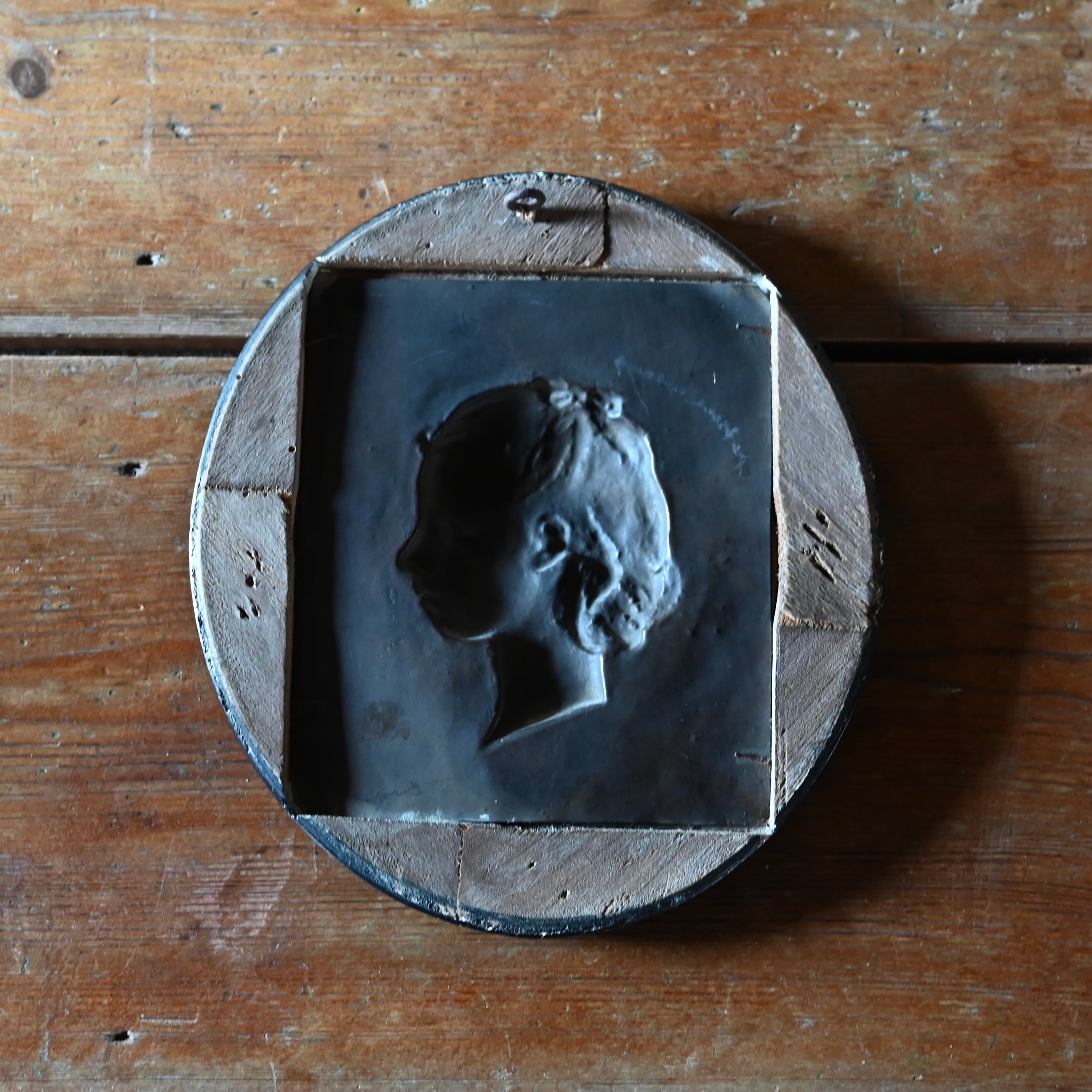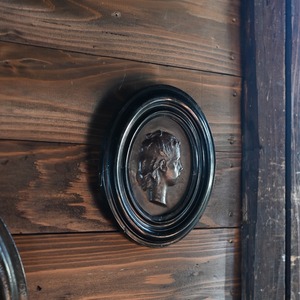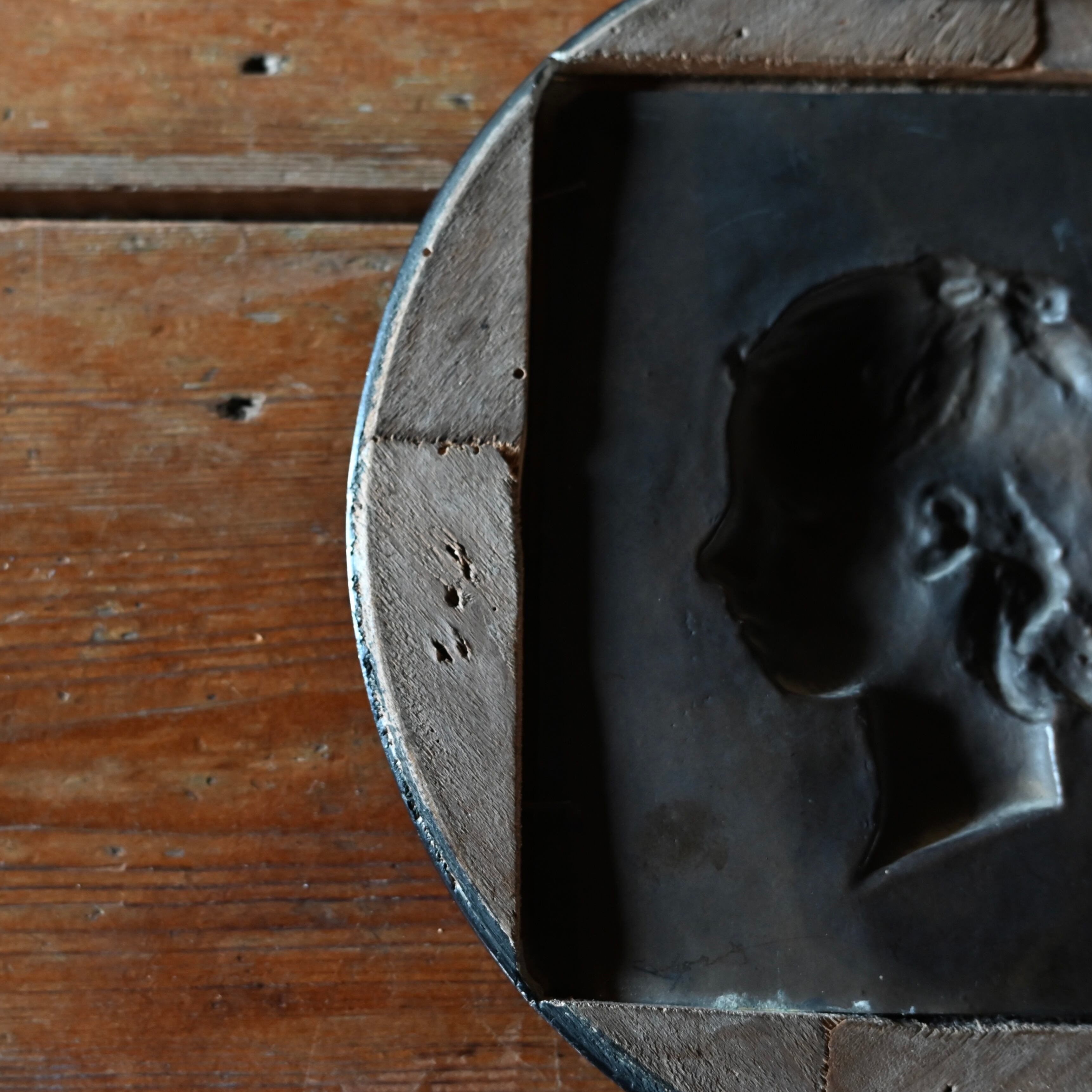 ブラックの木製フレームに女性の横顔をプレスした銅のプレートが釘で嵌められています。