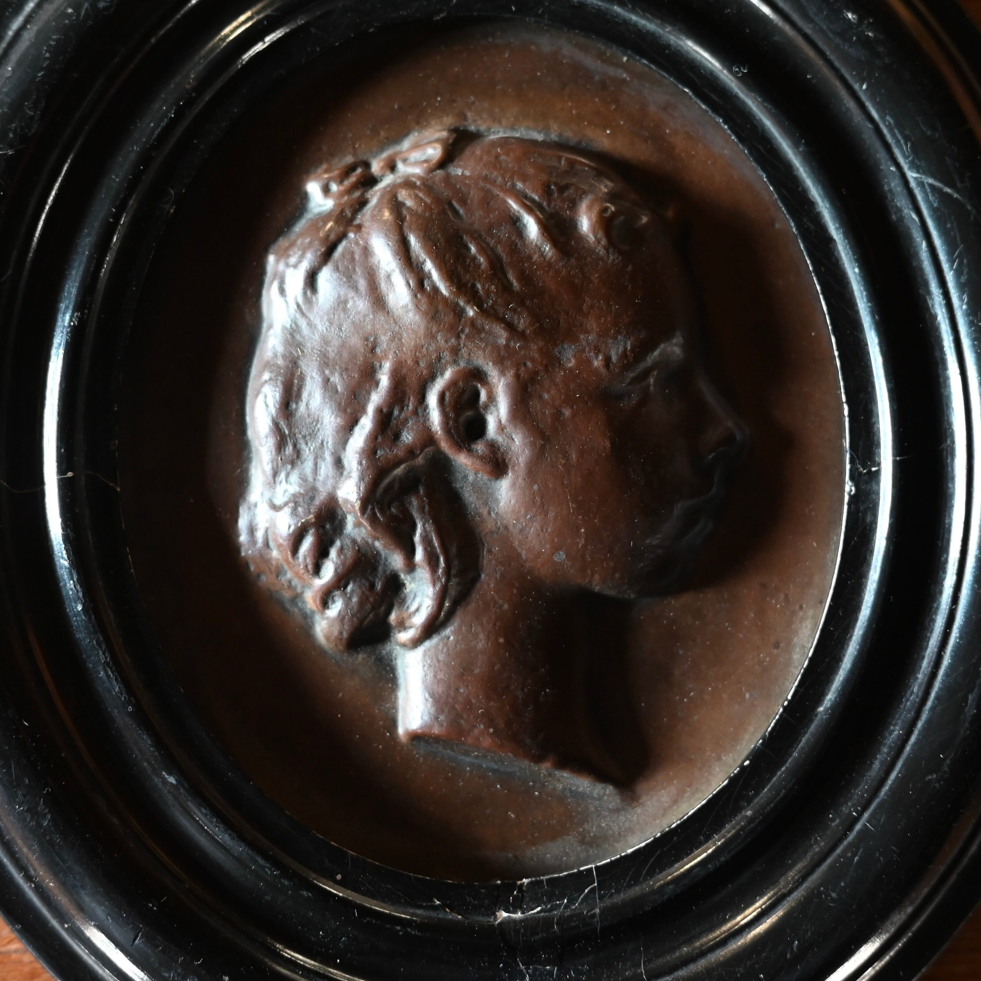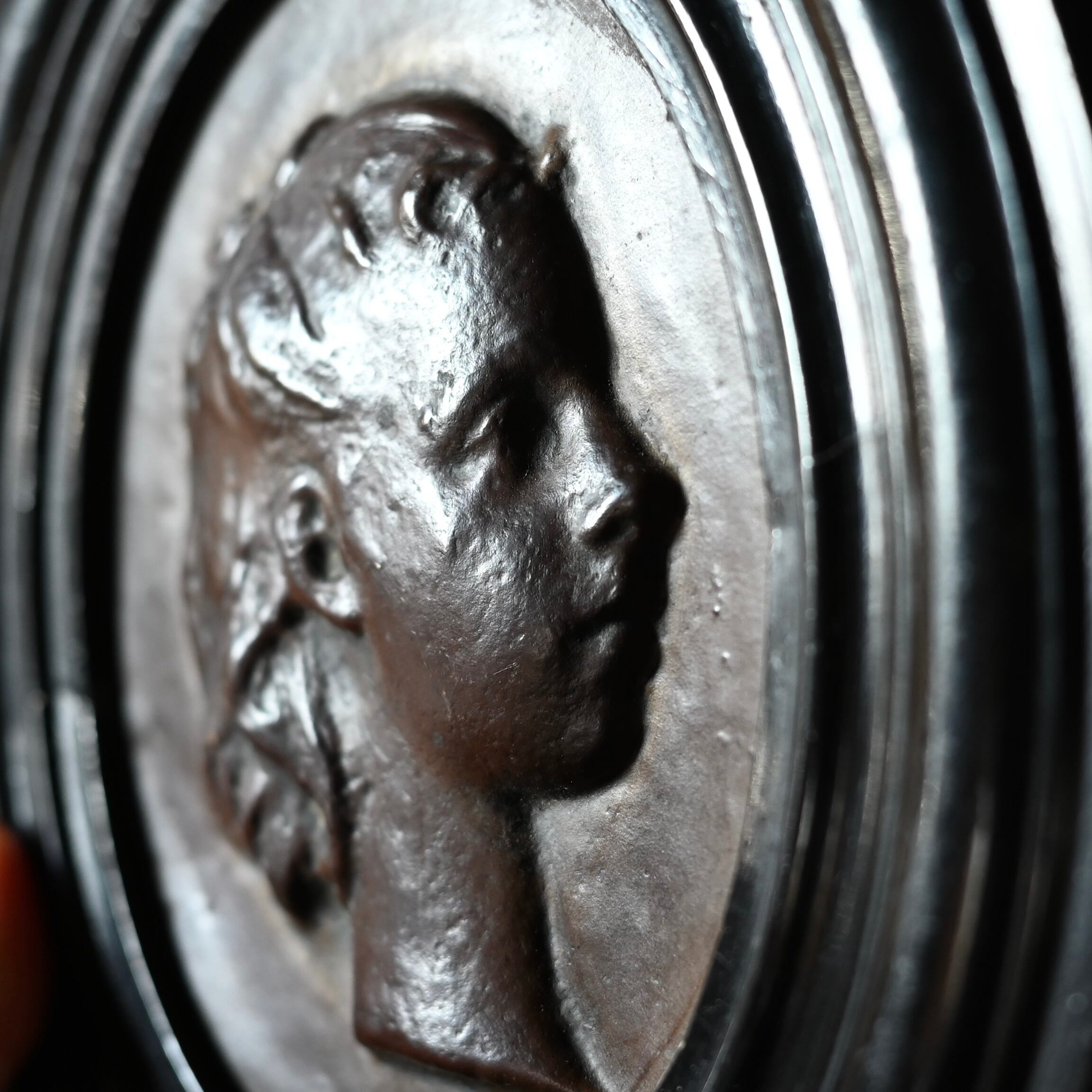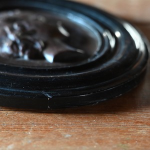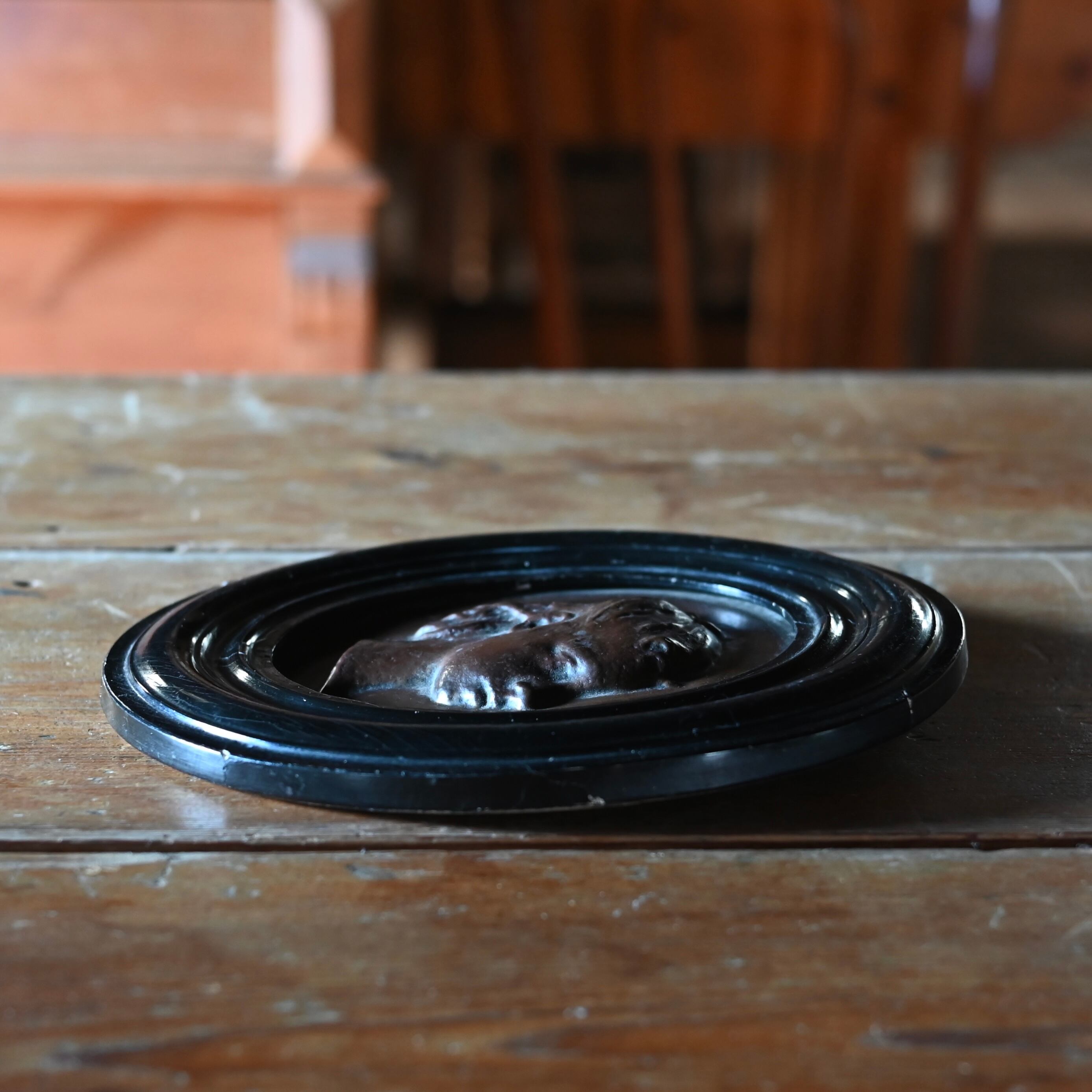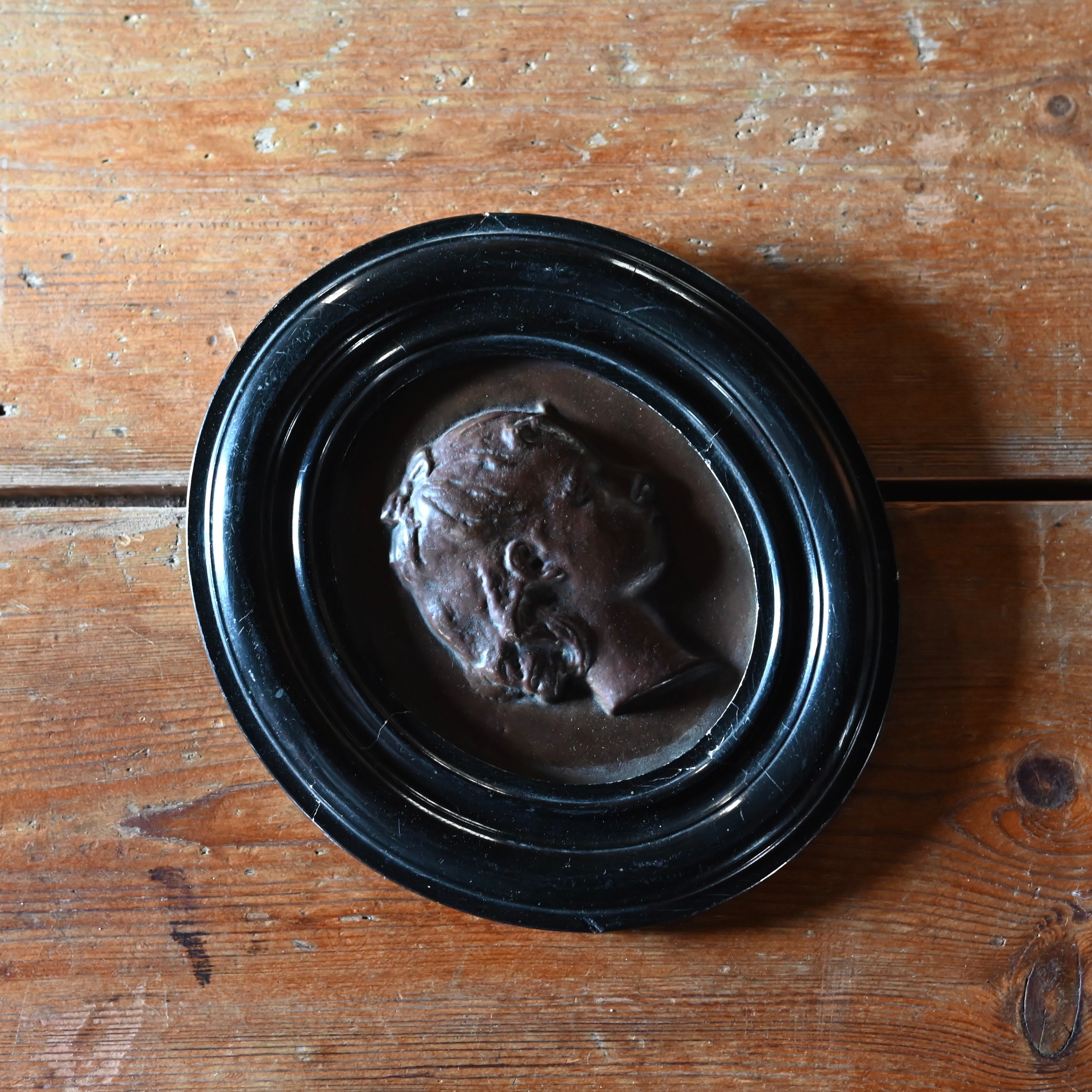 ブラックの木製フレームに女性の横顔をプレスした銅のプレートが釘で嵌められています。