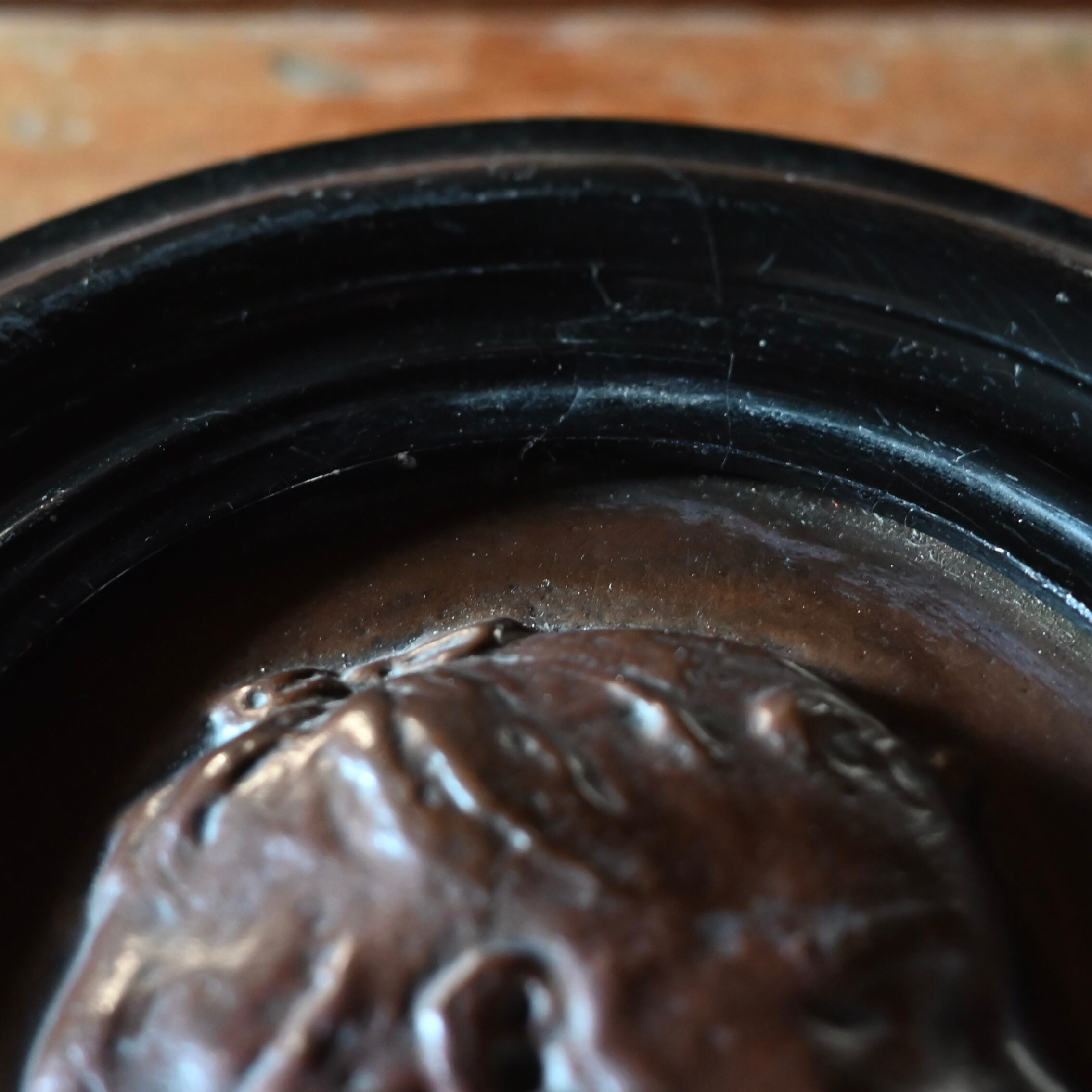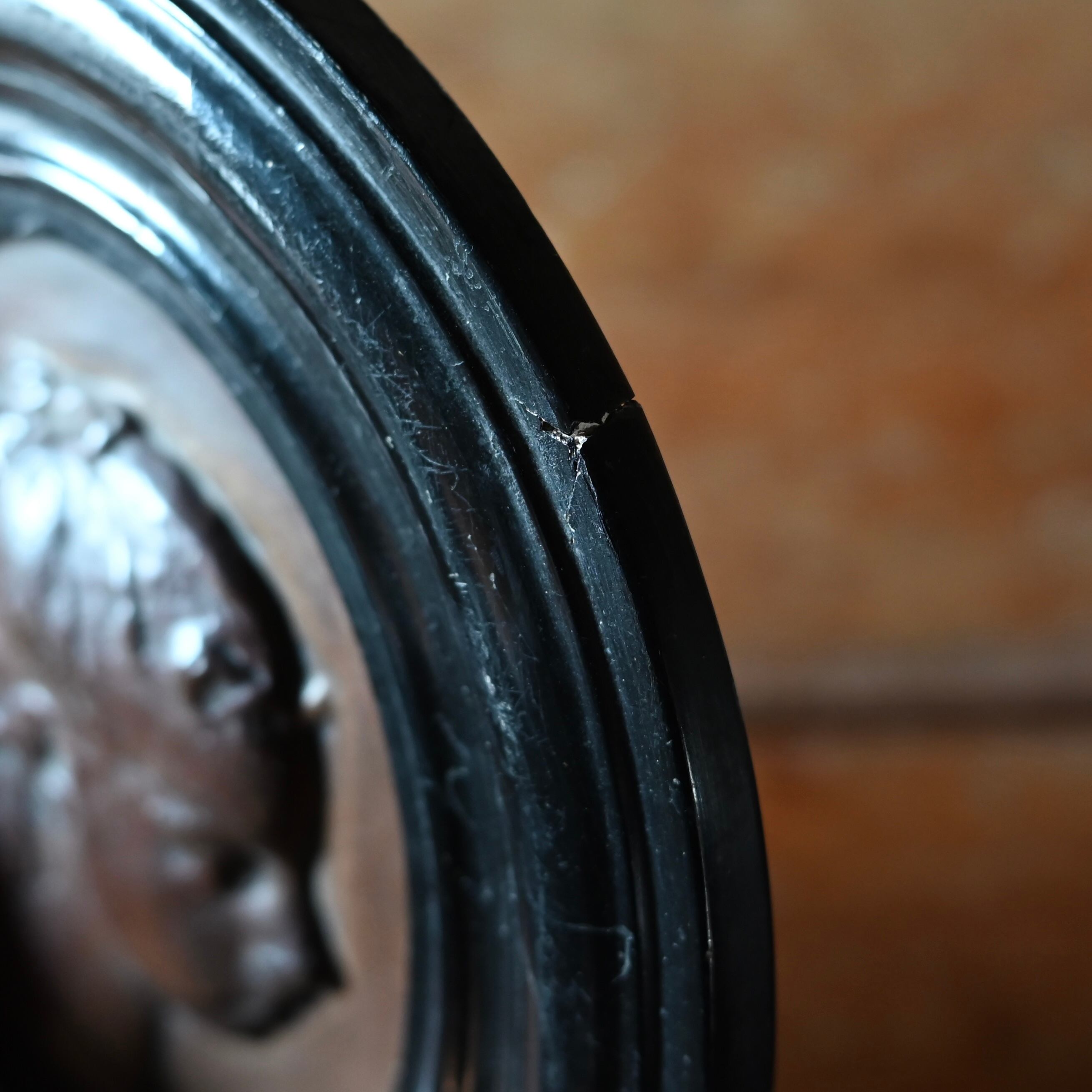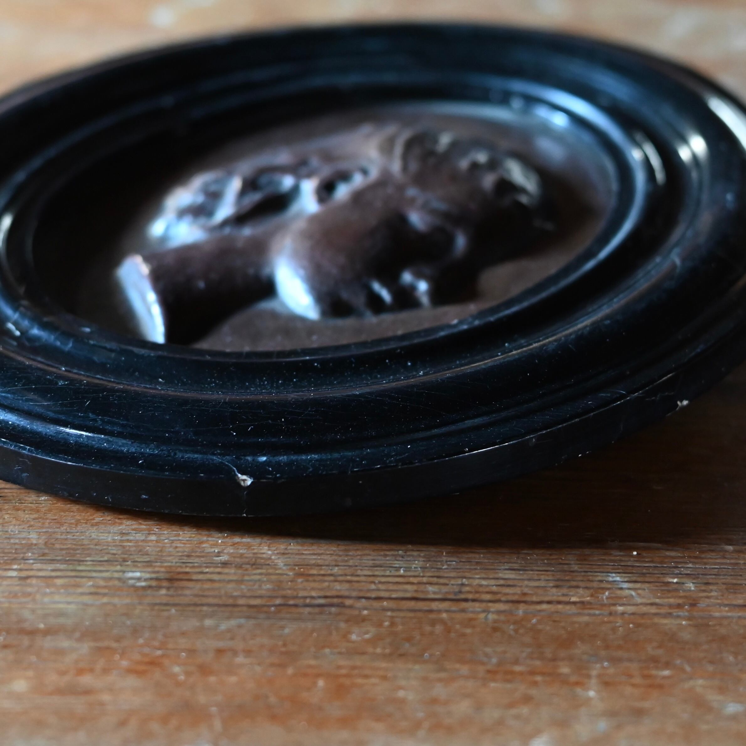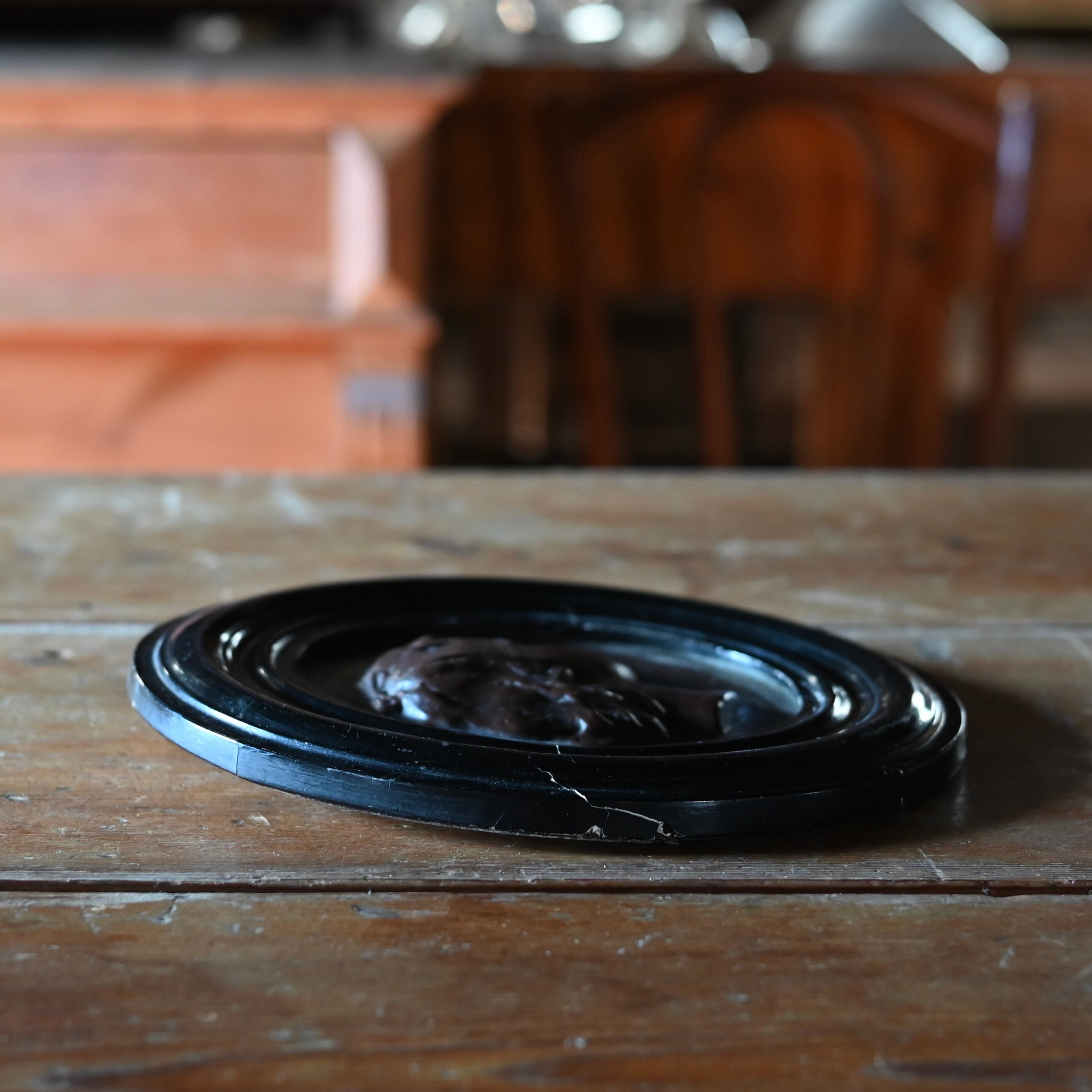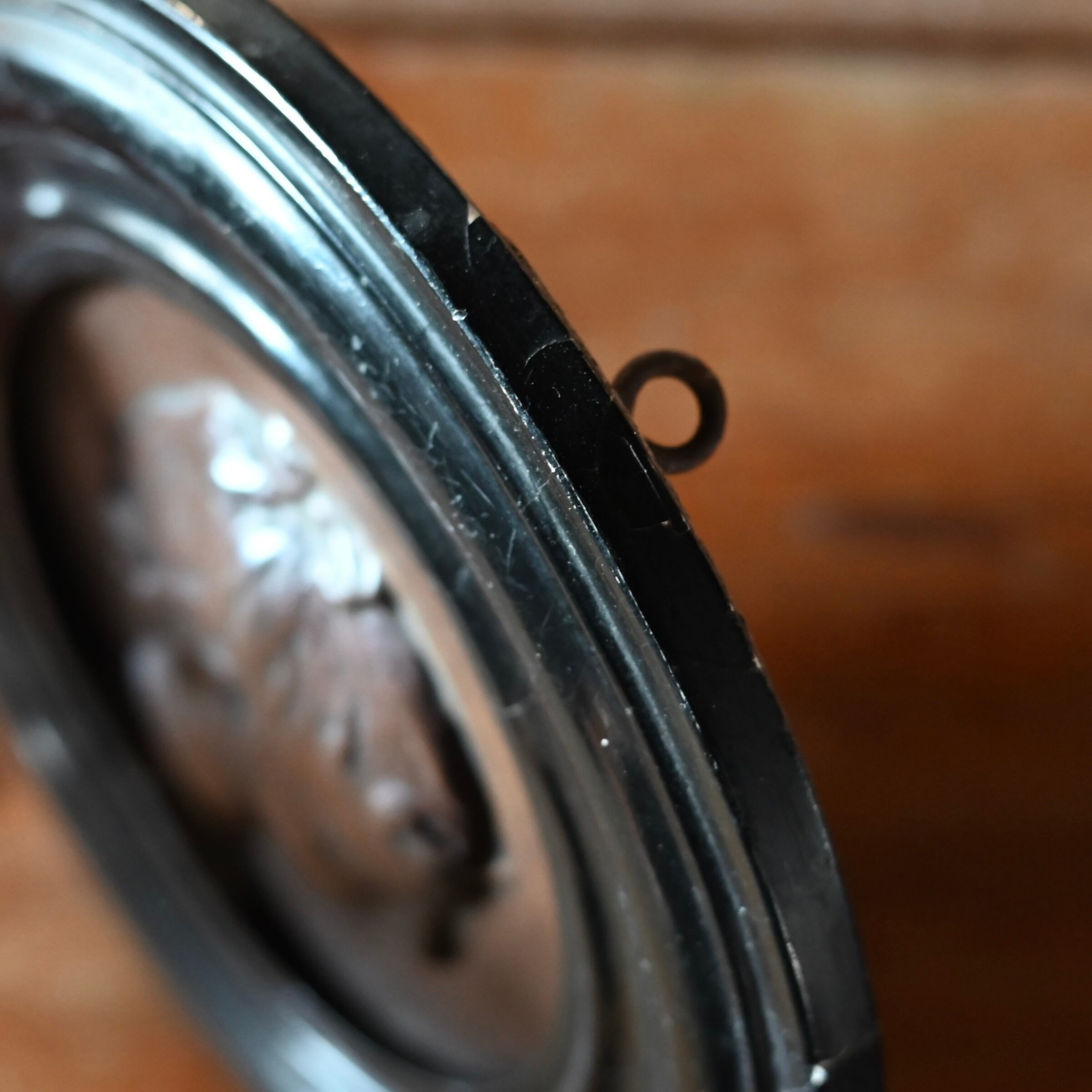 ブラックの木製フレームに女性の横顔をプレスした銅のプレートが釘で嵌められています。