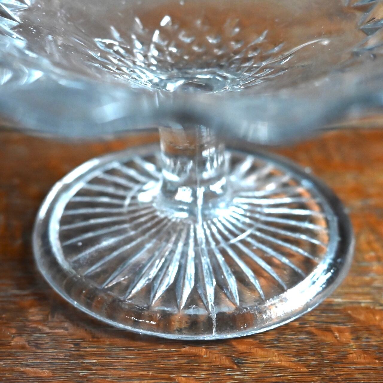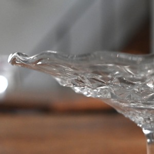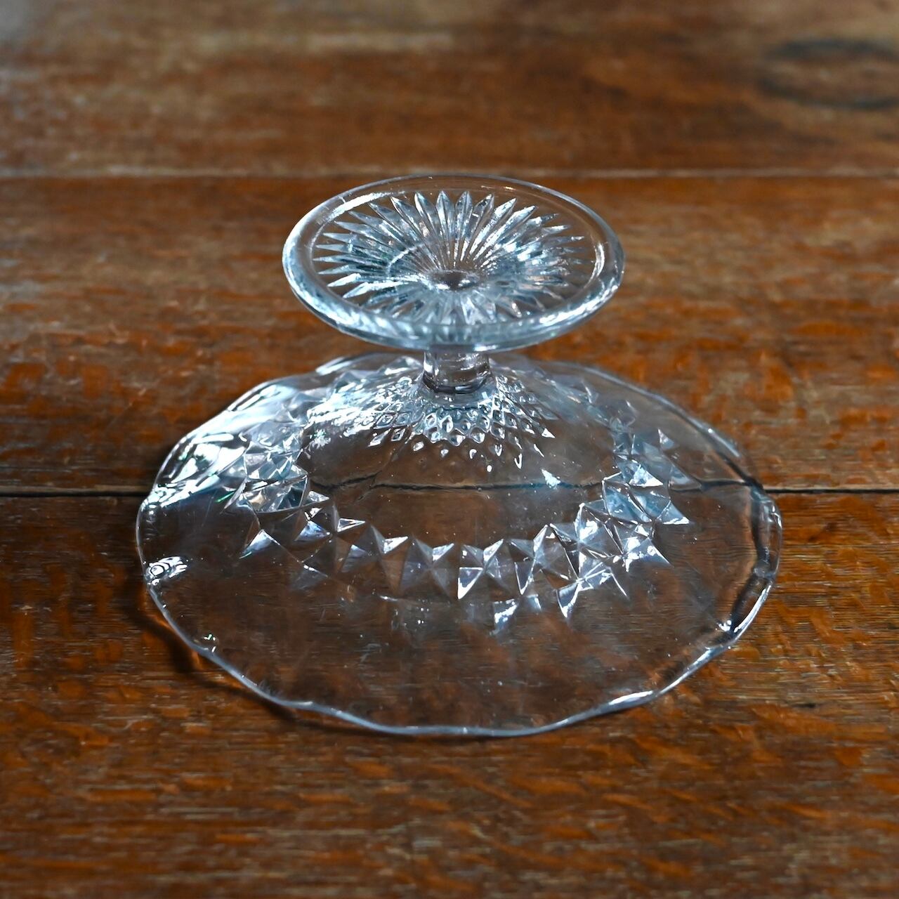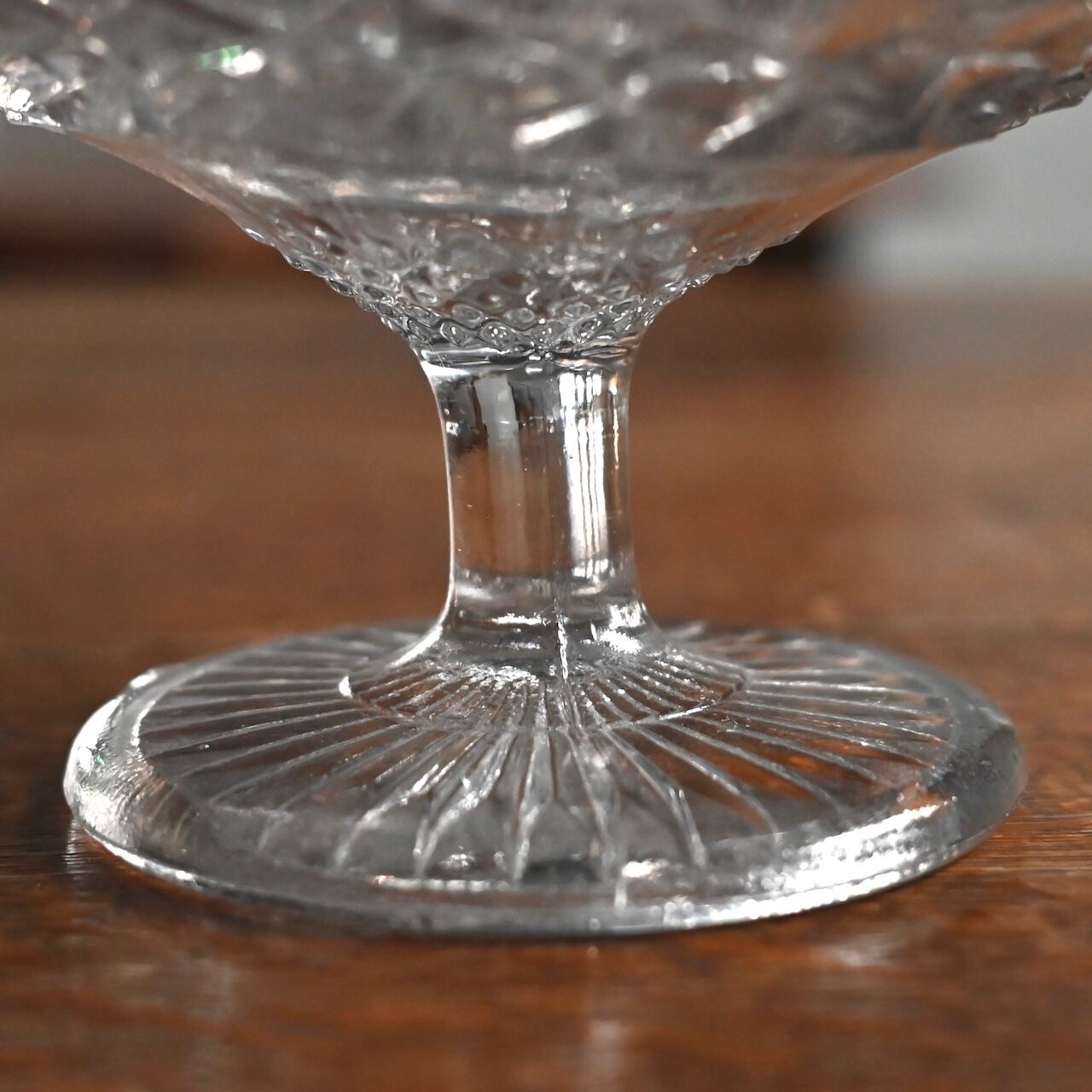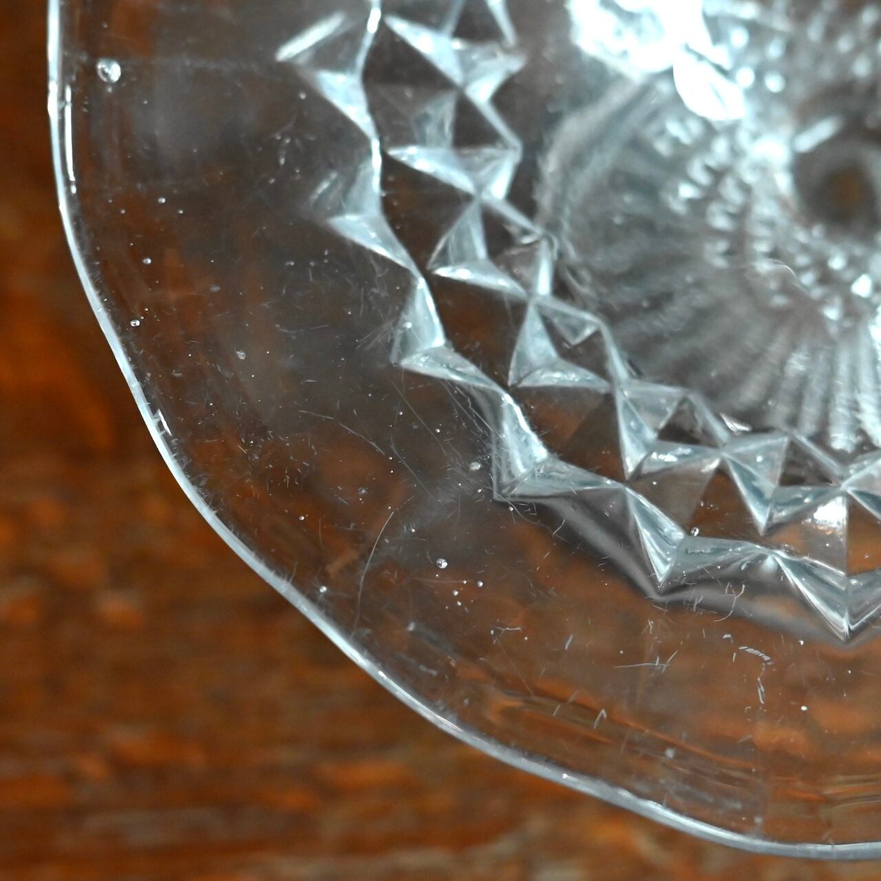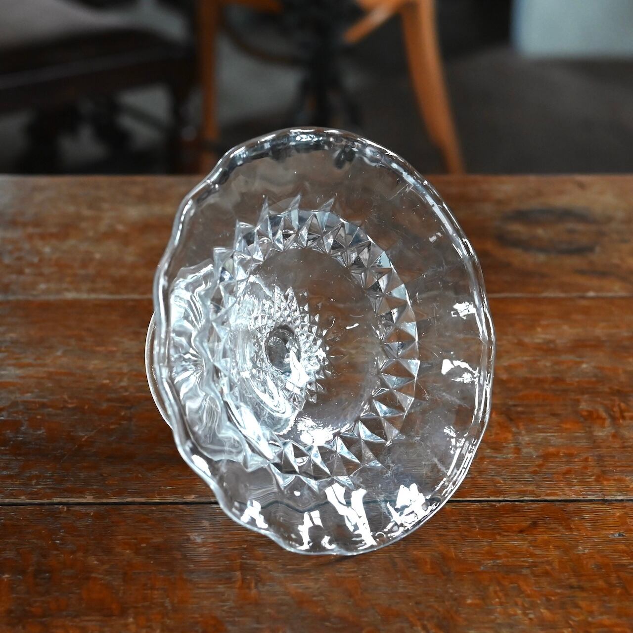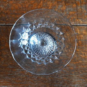 溶かしたガラスを型に流し込んで形成するプレスガラスで作られたケーキスタンドです。