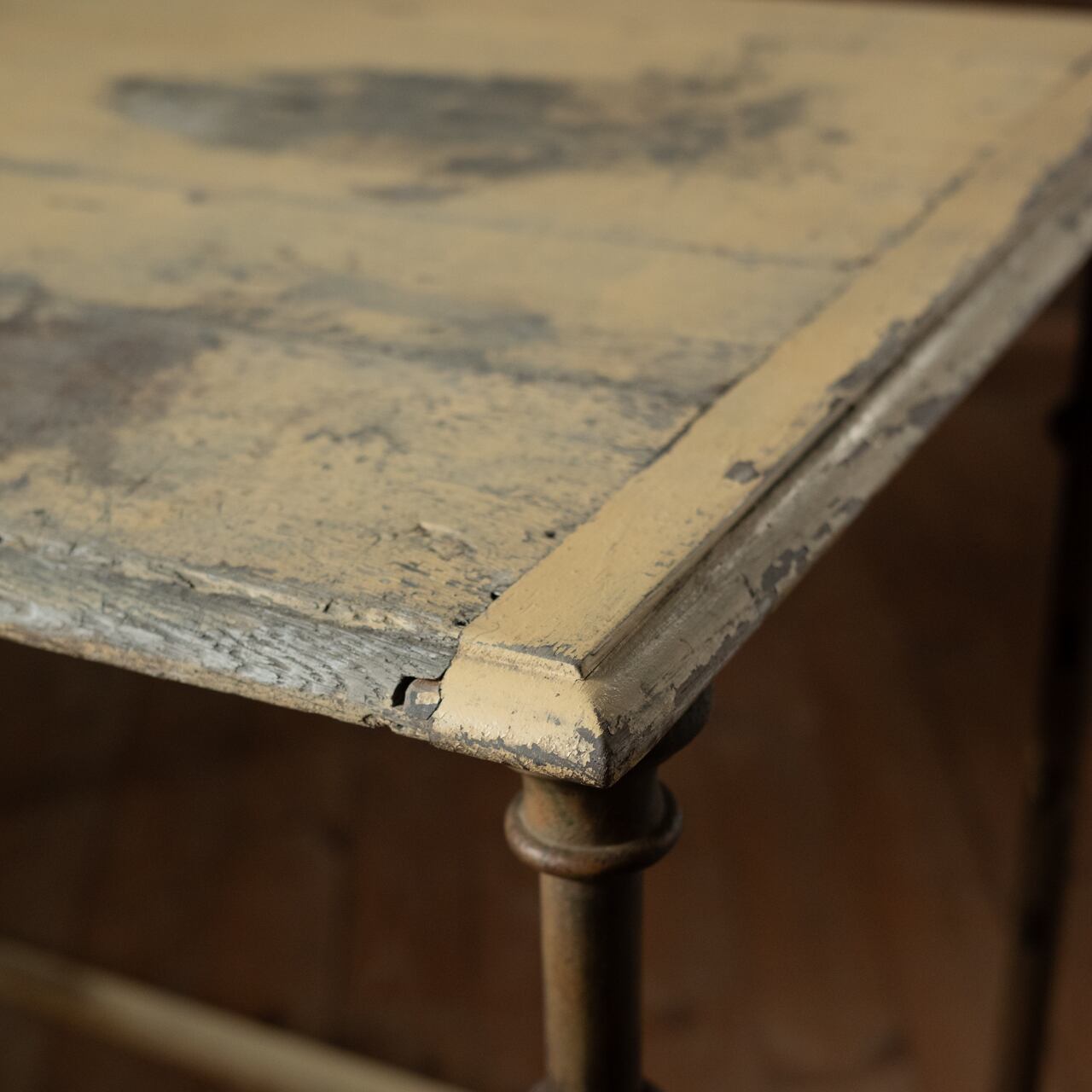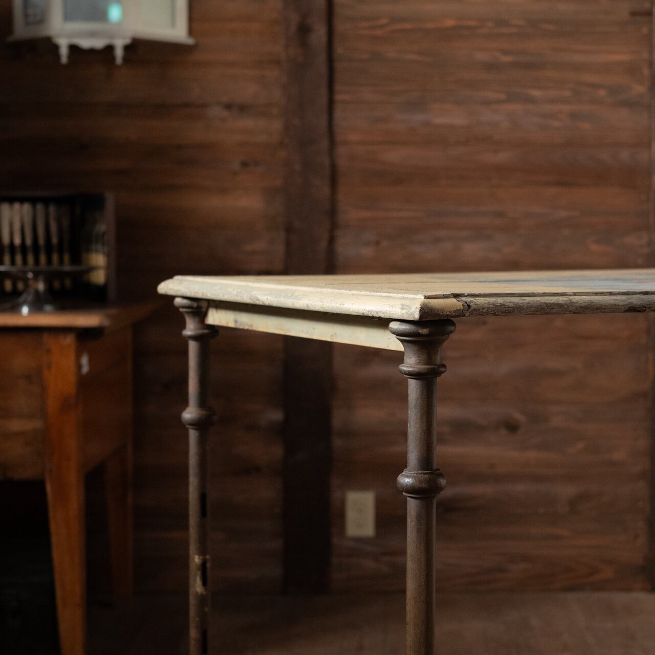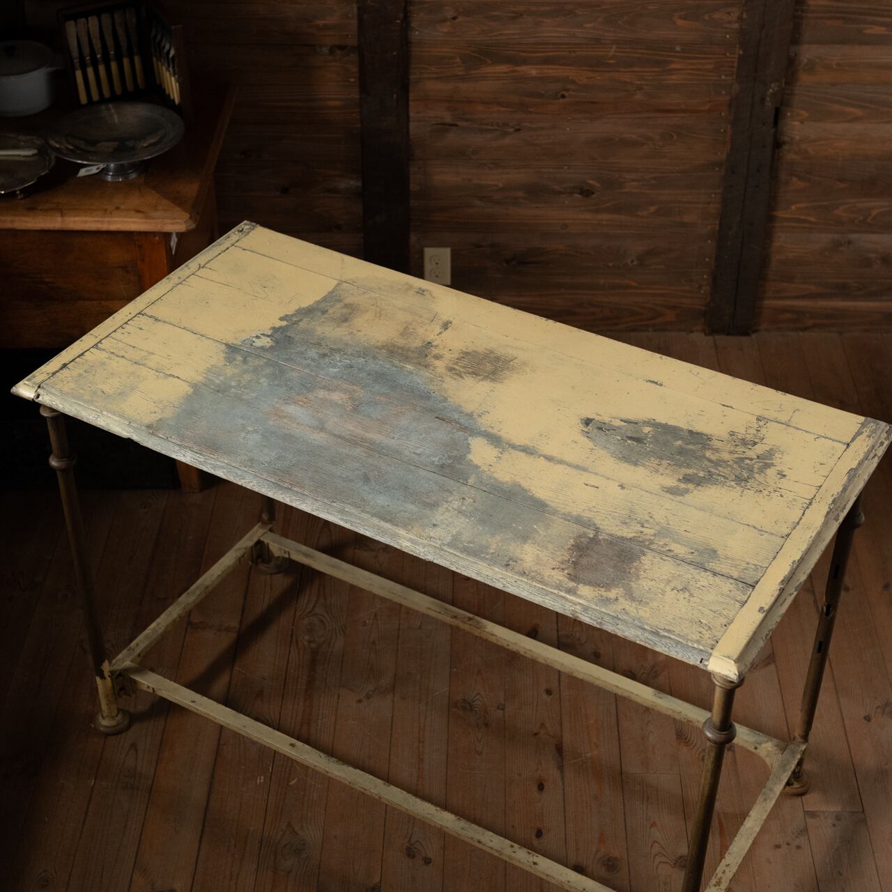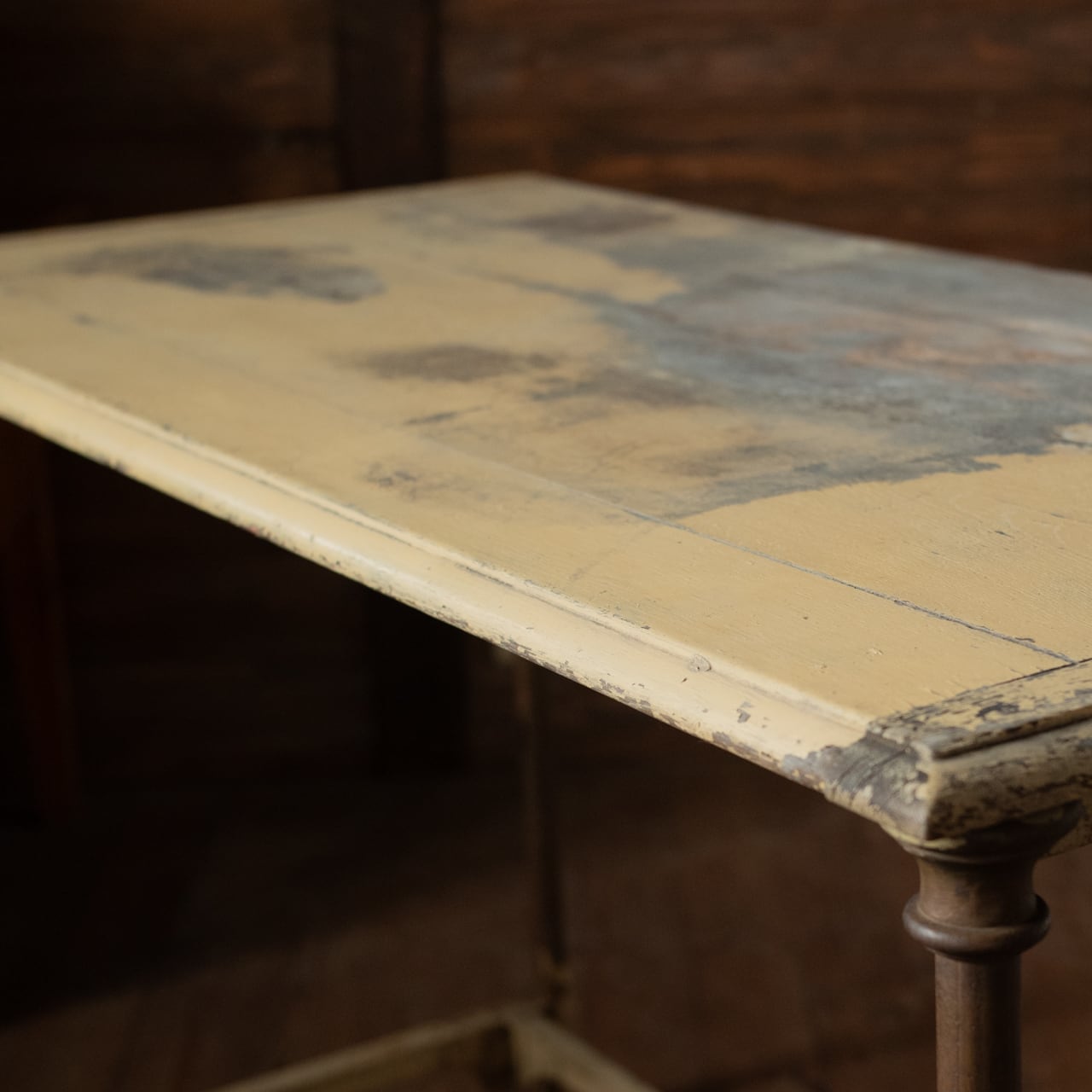 縁に飾りが入れられた天板はクリーム色に塗られ永い年月を掛け劣化して、なんともいえないシャビーな雰囲気を出しています。