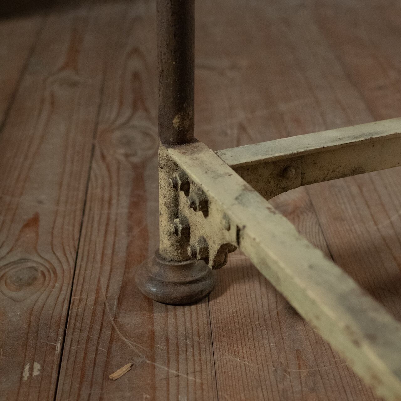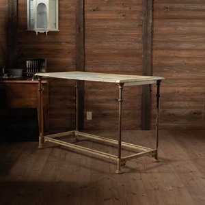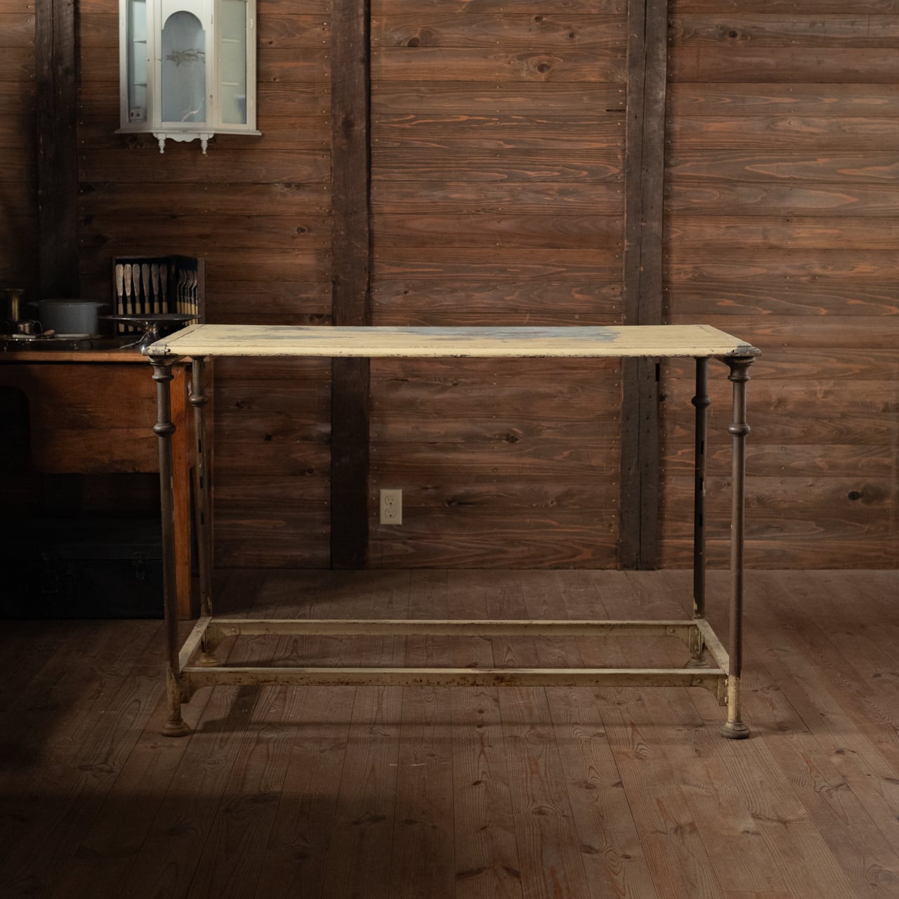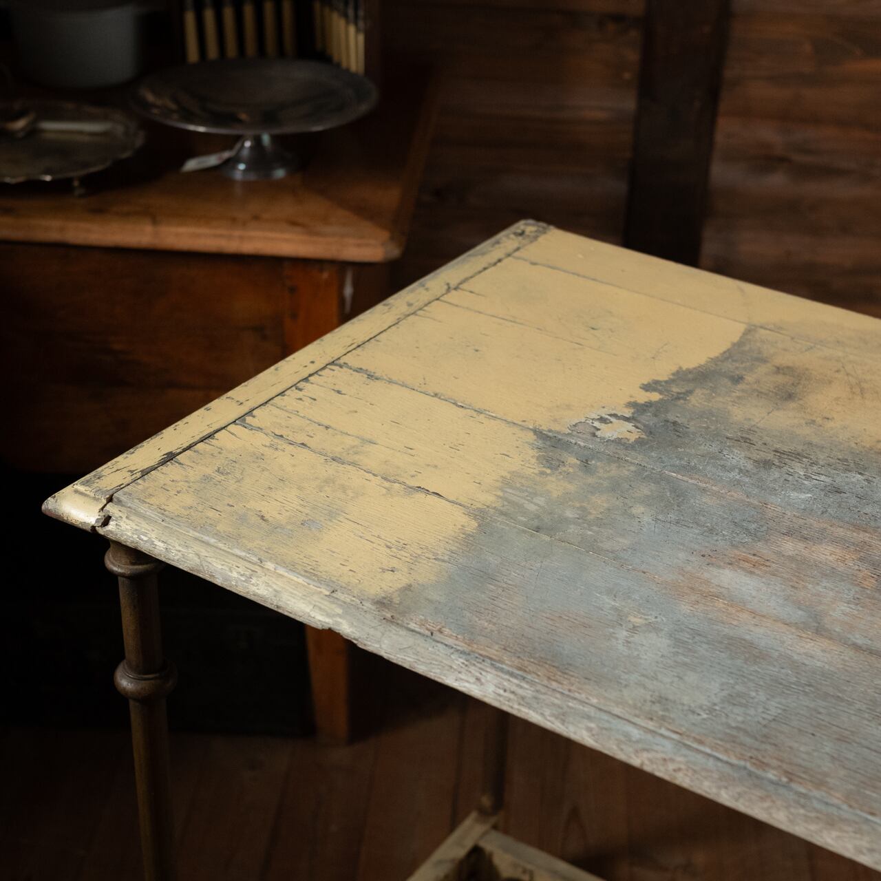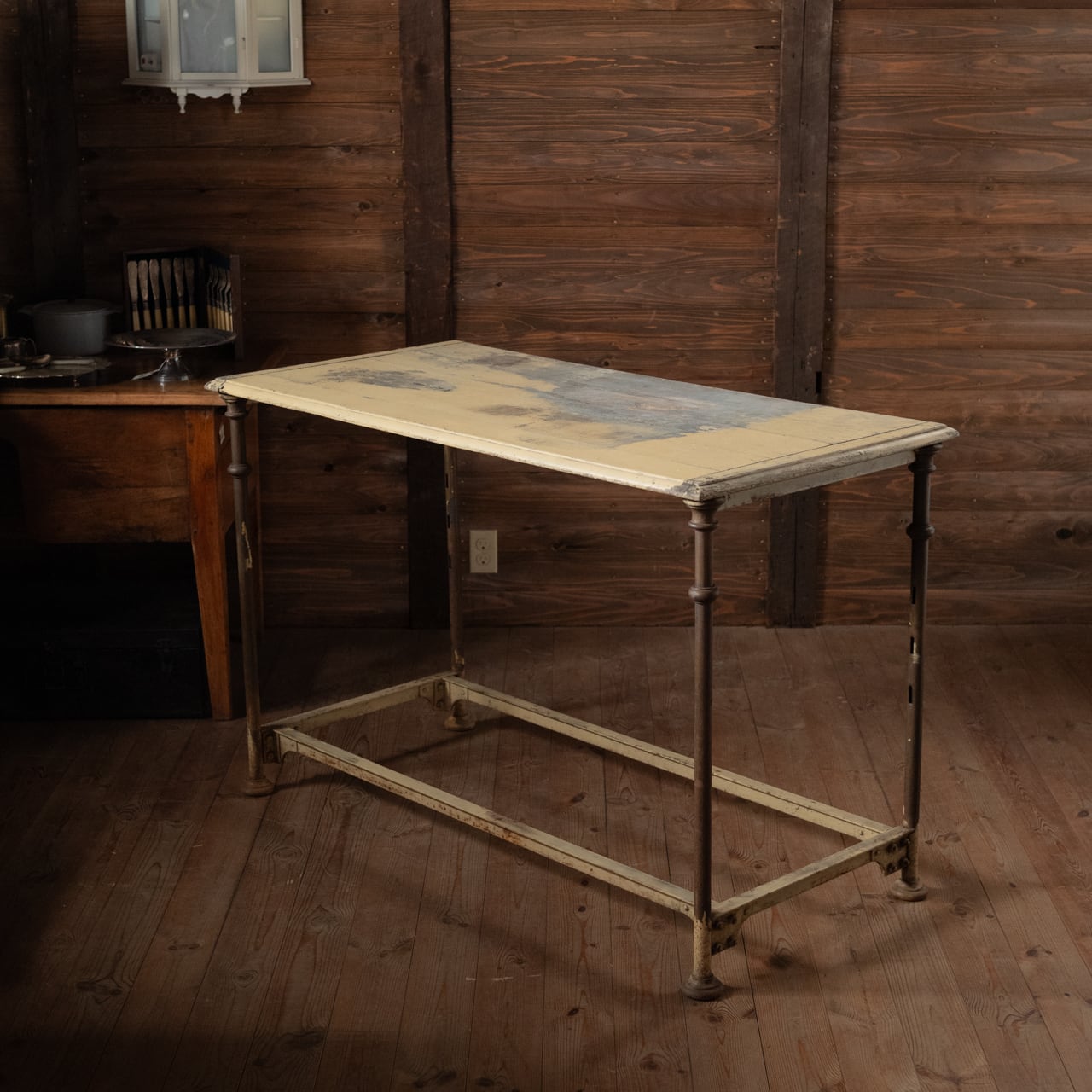 縁に飾りが入れられた天板はクリーム色に塗られ永い年月を掛け劣化して、なんともいえないシャビーな雰囲気を出しています。