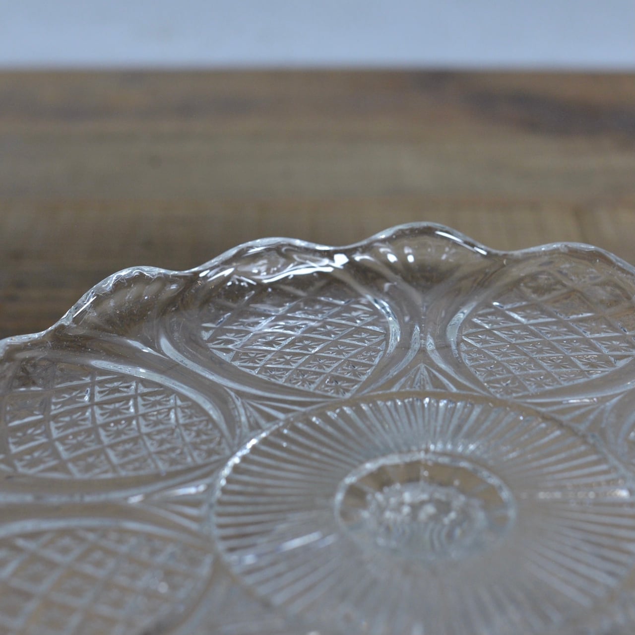 溶かしたガラスを型に流し込んで形成するプレスガラスで作られたケーキスタンドです。