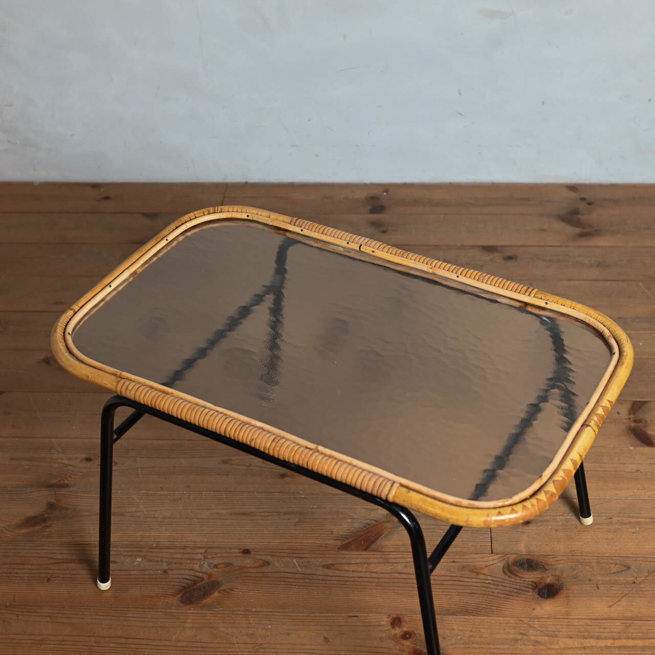 ラタンのフレームにモザイクガラス、黒のスチールの脚の組み合わせが素敵なこのテーブルは、ソファに合わせてセンターテーブルやサイドテーブルとして使って頂いたり、窓際で植物を置く台としてもおすすめです。
