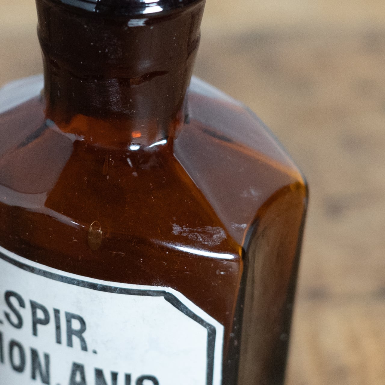 深めのアンバー色が素敵で、くすみや傷が多数あり、アンティークの魅力が詰まったボトルです。